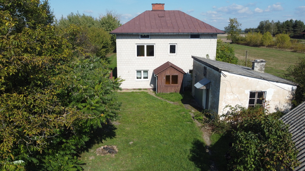 .-dom o pow. 140 m2. w bardzo dobrym stanie technicznym. Wykonany w cegły, dach kopertowy pokryty blachą. Okna wymienione na nowe - PCV. Do domu prowadzi weranda o pow. 4 m2. Na parterze mamy korytarz o pow. 8 m2, kuchnię o pow. 17 m2, pokój o pow. 18 m2, kotłownię o pow. 19 m2, spiżarkę o pow. 6 m2. Na piętrze mamy korytarz o pow. 8 m2, kuchnię o pow. 17 m2, dwa pokoje o pow. 18 m2 i 19 m2, łazienkę o pow. 6 m2. W kuchniach na parterze i piętrze mamy piece kaflowe. Na poddasze prowadzi klatka schodowa. Poddasze z możliwością zagospodarowania.