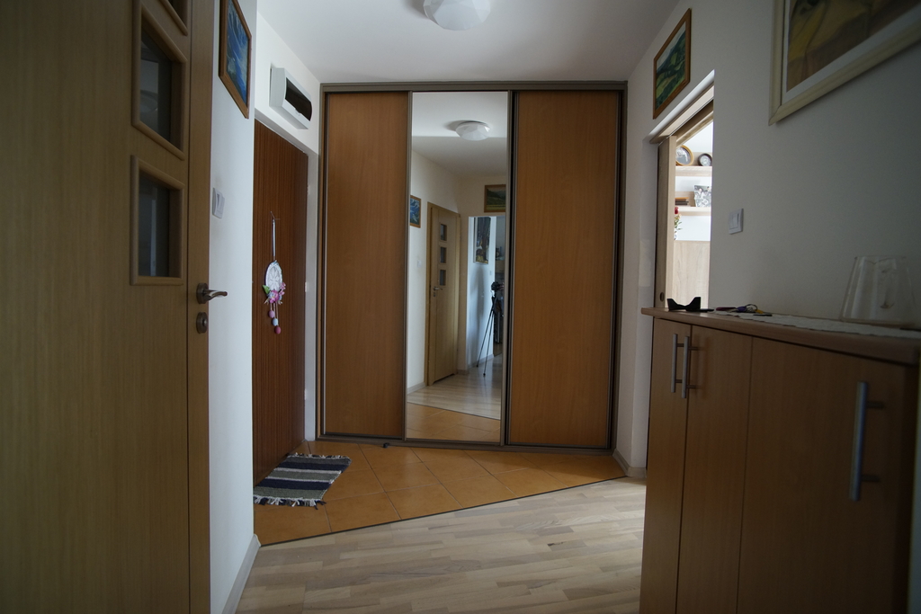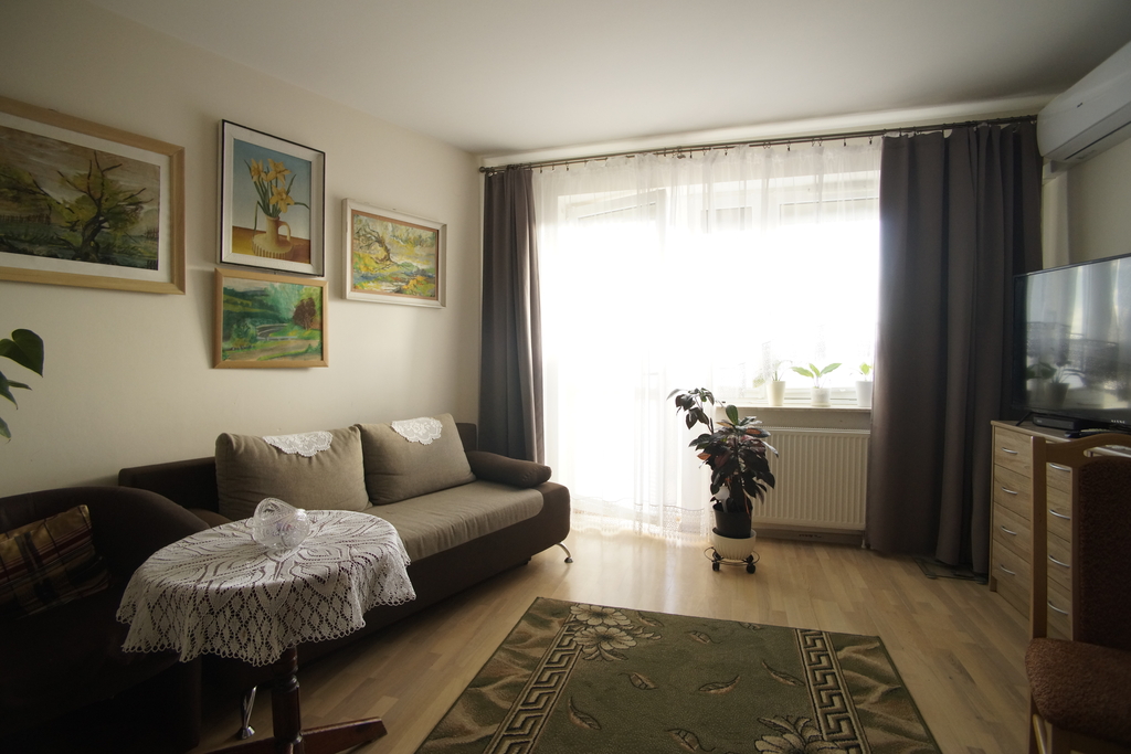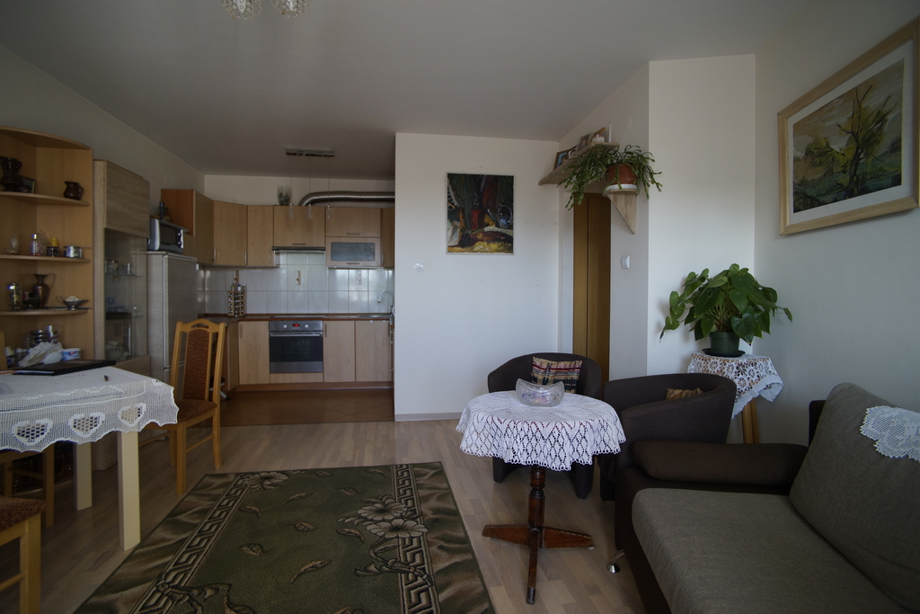 Mieszkanie jest wyjątkowo ładne i funkcjonalne. Całość składa się z dużego salonu połączonego z otwartą kuchnią oraz pokoju. Z obydwu tych pomieszczeń można wejść na przestronny balkon, który nie sąsiaduje bezpośrednio z innymi, przynależnymi do pobocznych lokali. Mieszkanie jest w bardzo dobrym stanie - zadbane, estetyczne i dobrze wyposażone. Praktycznie nie wymaga specjalnych nakładów finansowych. W zabudowanej kuchni są wszelkie niezbędne sprzęty, pokoje są umeblowane. W przedpokoju znajduje się obszerna szafa wnękowa. Do lokalu przynależy piwnica.