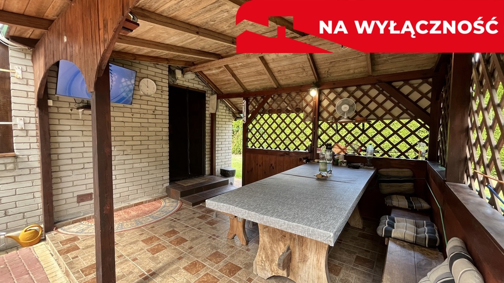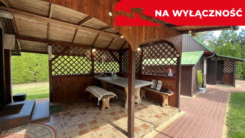 - na działce znajdują się dwa budynki. Pierwszy główny wymurowany z cegły. Ok. 10 lat temu został wyremontowany. Wymieniona została instalacja elektryczna, okna, odnowione ściany oraz wykonano pomieszczenie łazienki. W jednym z pokoi jest kominek w pełni użytkowy. Wchodząc do domu mamy korytarz o pow. 7 m2, dwa pokoje, praktycznie tej samej powierzchni po 20 m2. oraz łazienkę o pow. 7 m2 z prysznicem , pełnym wyposażeniem, boilerem do podgrzewania wody. Podłoga z terakoty jest elektrycznie podgrzewana. Przed domem jest zadaszony taras o pow. 11 m2 z solidnym stołem oraz telewizorem. Zabezpiecza on wejście do domu oraz daje możliwość odpoczynku w zacienionym miejscu.