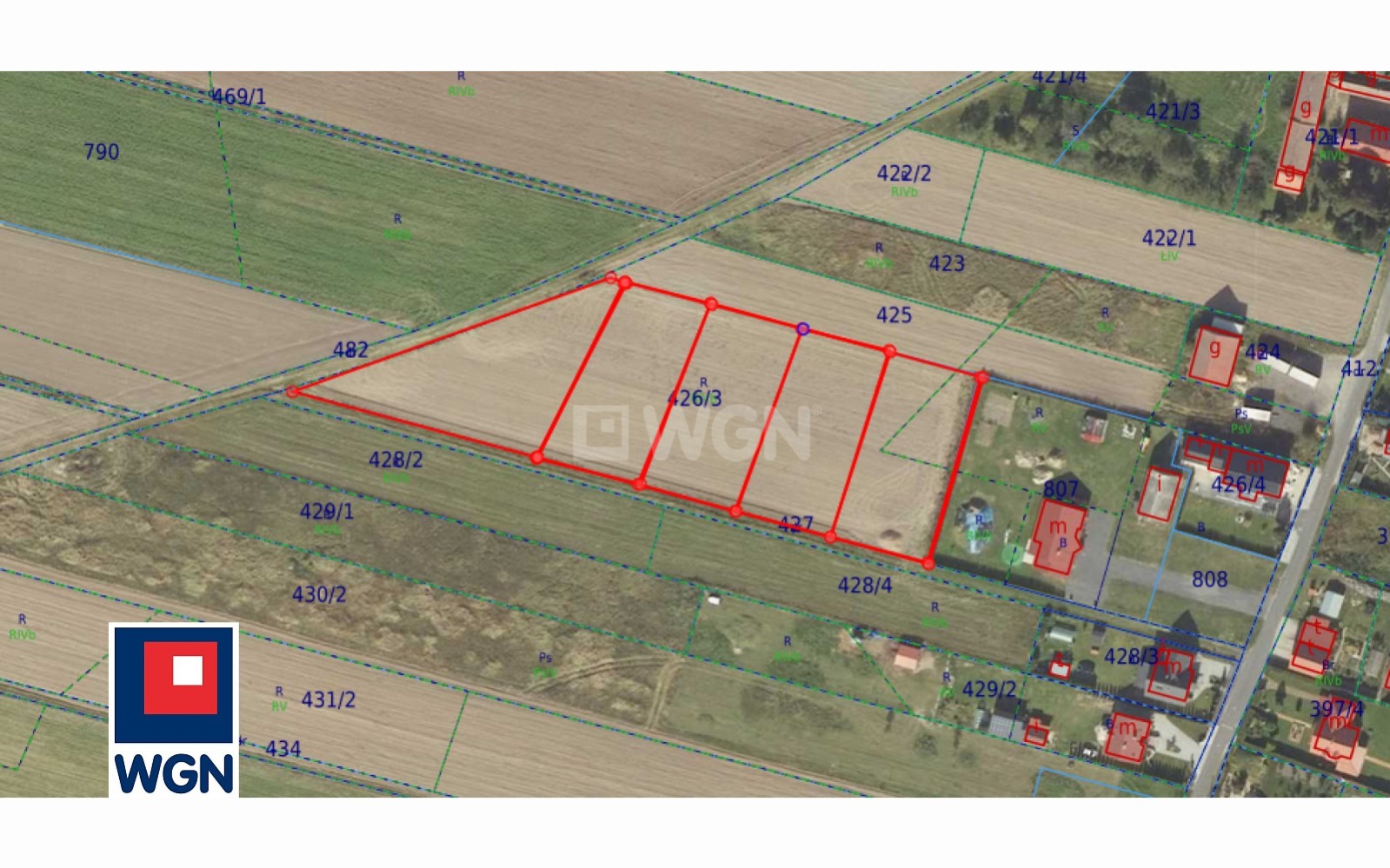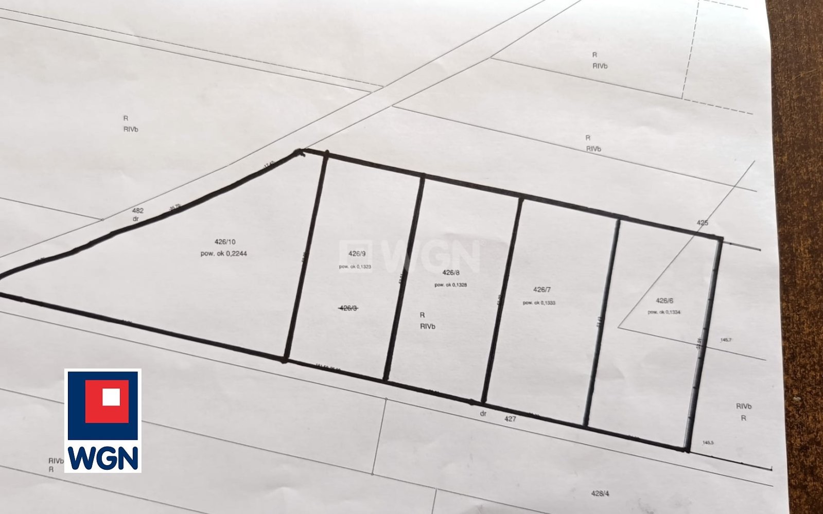 Działki powstały z podziału gruntu nr 426/3, jednakże nie naniesiono jeszcze aktualizacji na portalach (podział z mapy Geoportal 2 wykonany orientacyjnie według aktualnych dokumentów geodezyjnych).