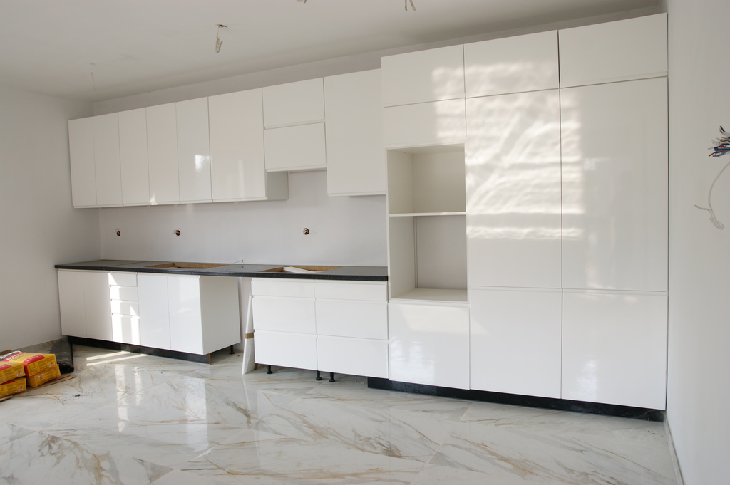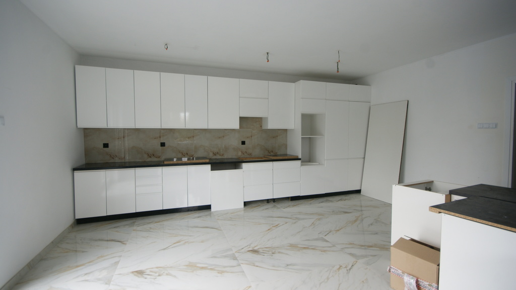 - na poziomie zero częściowo ułożone płytki podłogowe oraz rozpoczęto wykonanie zabudowy meblowej kuchennej
