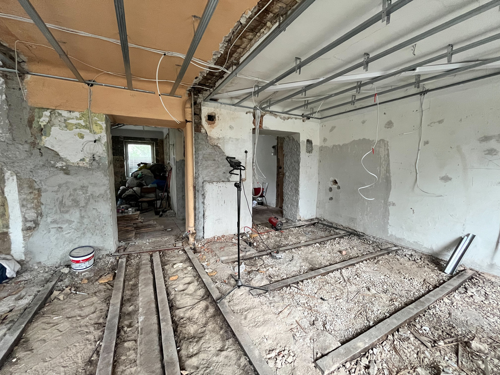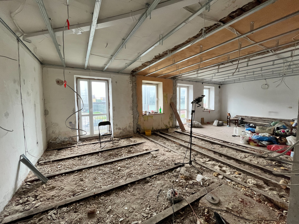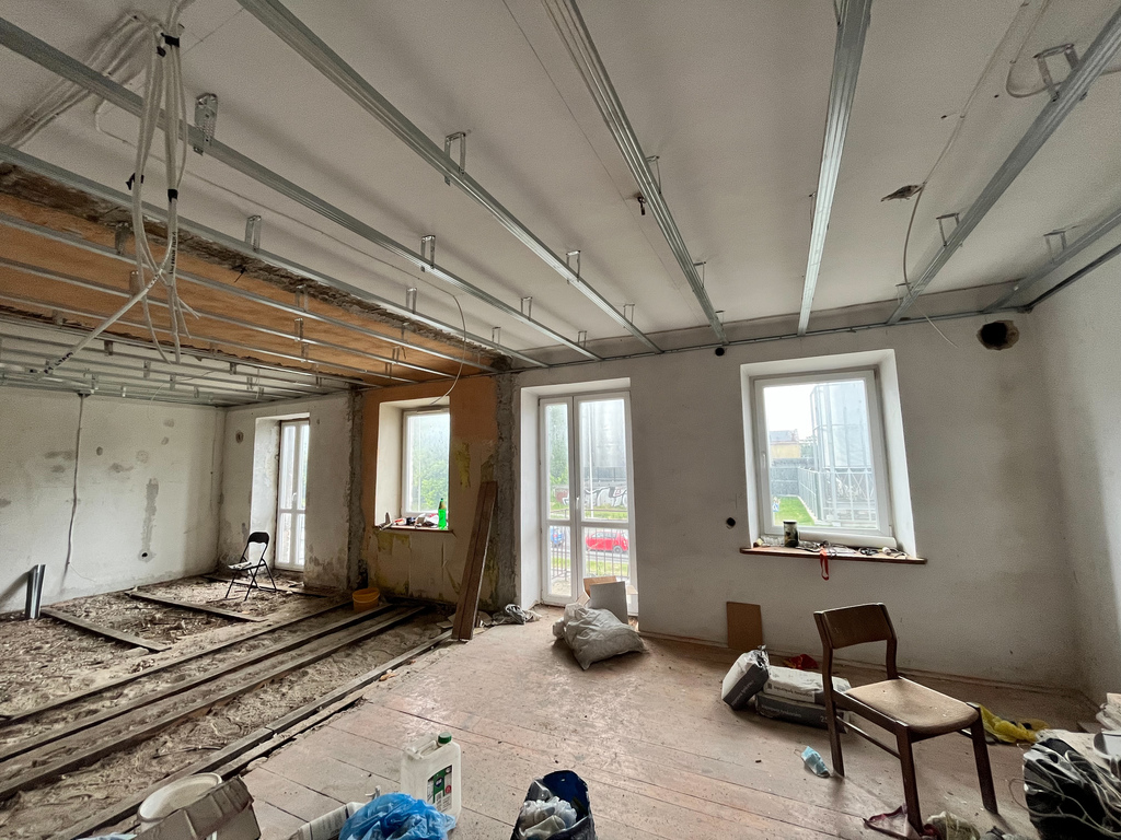 Stan: Rozpoczęty remont (wyburzone ścianki działowe, zdemontowane piece kaflowe, podwieszony stelaż pod sufit, częściowo rozprowadzono kable pod oświetlenie)