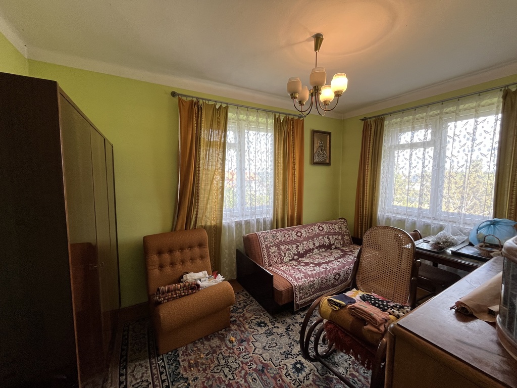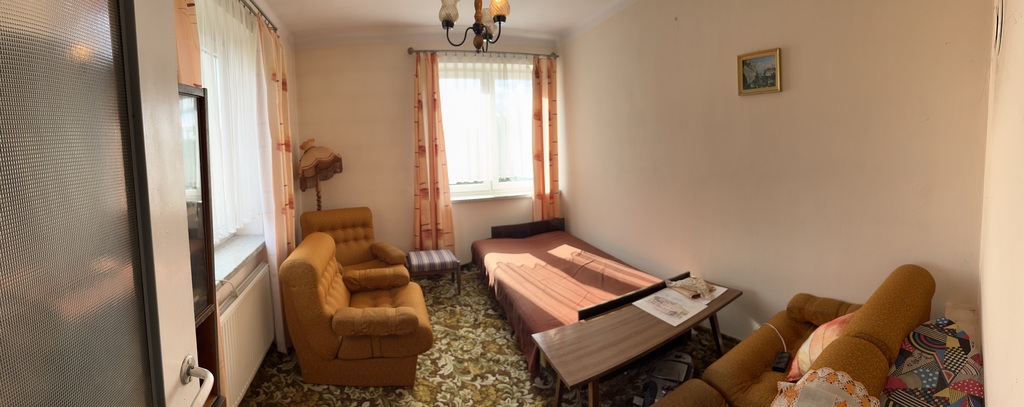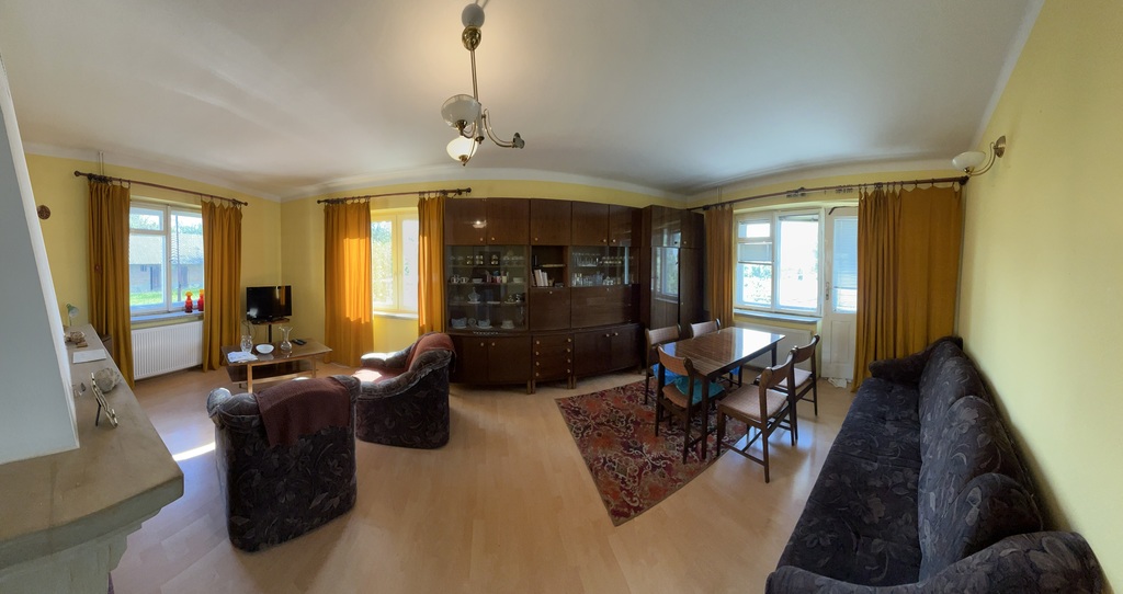 -na parterze znajduje się weranda o pow. 10 m kw, przedpokój o pow. 6,5 m kw, kuchnia o pow. 12 m kw, duży pokój o pow. 27 m kw z kominkiem, łazienka 3,5 m kw.