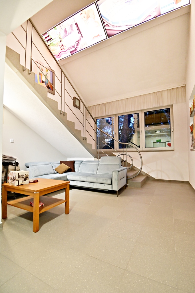 - Stolarka okienna: drewniana (sosna, mahoń) oraz aluminiowa firmy Schuco. Wszystkie większe powierzchnie szybowe wstawione mają szkło antywłamaniowe P-4, z warstwą termo-chromatyczną selektywną.