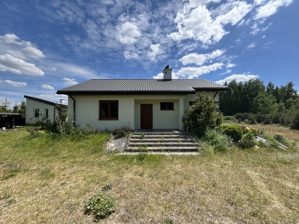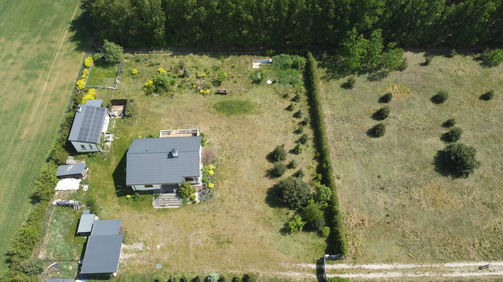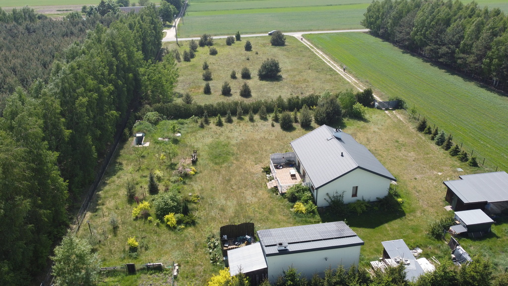 - dwa domy wolnostojące . Pierwszy dom o pow. 80 m 2 wybudowany w 2018 r w z zastosowaniem nowoczesnych rozwiązań typu ogrzewanie podłogowe, instalacja fotowoltaiczna o dużej mocy 6kW która pokrywa zapotrzebowanie na energię elektryczną, przydomowa oczyszczalnia ścieków. Dom bez piwnicy i użytkowego poddasza. Składa się z przedpokoju (korytarza) o pow. 4,2 m2, kuchni o pow. 9 m2, trzech pokoi o pow. 26,5 m2, 10 m2, 13 m2, łazienki o pow. 5,5 m2, kotłowni o pow. 3,5 m2. Z największego pokoju wychodzi się na duży taras o pow. 26,5 m2. Prowadzą na niego dwie pary drzwi dwuskrzydłowych bez słupka środkowego. Przed zbytnim nasłonecznieniem chroni rozkładana markiza. W kotłowni piec CO ze sterownikiem na pellet dobrej firmy. W łazience zainstalowano wannę , kabinę prysznicową oraz wyjście pod bidet. W domu zainstalowane systemy typu alarm, monitoring, videdomofon,