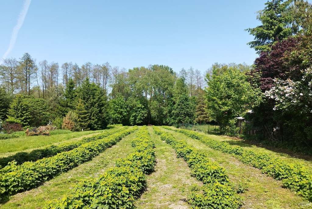 - ogród urządzony, zadbany, z nasadzeniami, w tym drzewami i krzewami owocowymi