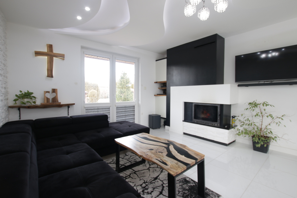 - kominek który nadaje klimatu w zimowe dni ale także dzięki turbinie rozprowadza ciepłe powietrze do każdego pomieszczenia