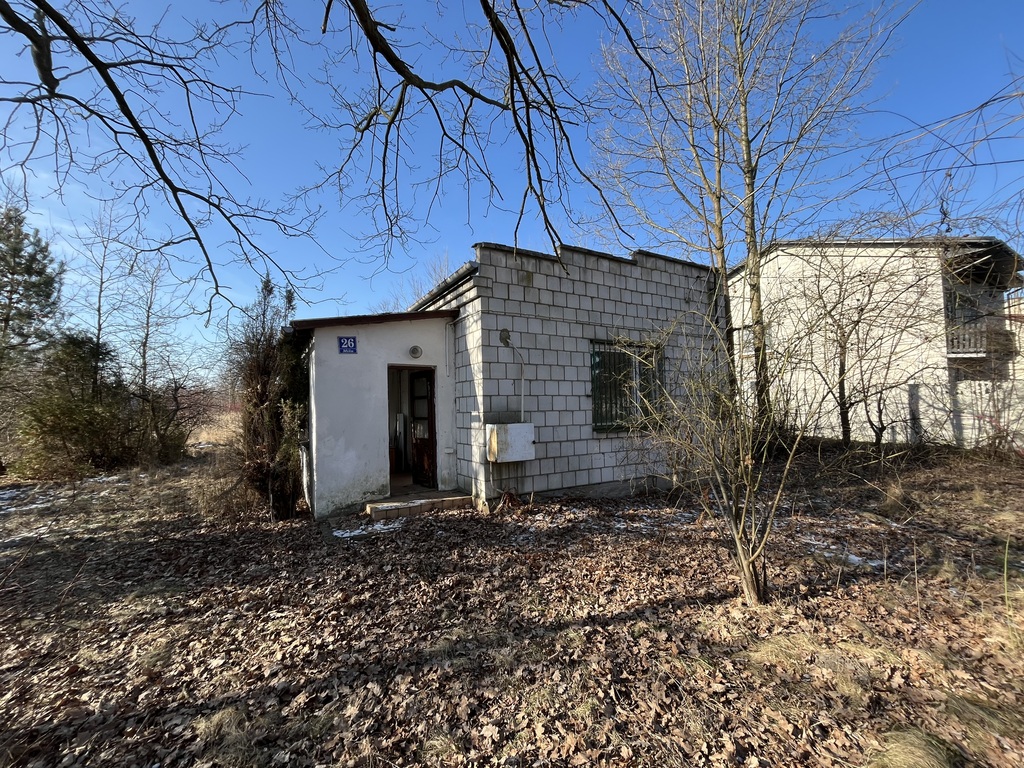 - na jednej części znajduje się budynek mieszkalny do generalnego remontu. Budynek parterowy wykonany z cegły o wymiarach 8 m x 5,5 m. Składa się on z ganku o pow. 5 m2, kuchni o pow. 13,5 m2, pokoju o pow. 18 m2, łazienki o pow. 3,5 m2, WC o pow. 2 m2. Do budynku doprowadzone praktycznie wszystkie media tj. prąd, woda z wodociągu oraz gaz. Na działce jest również studnia głębinowa oraz szambo. Budynek można wykorzystać jako tymczasowy dla pracowników na czas budowy inwestycji.
