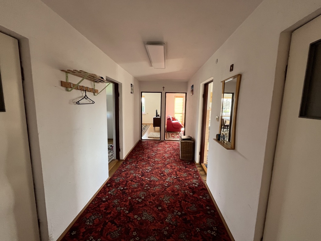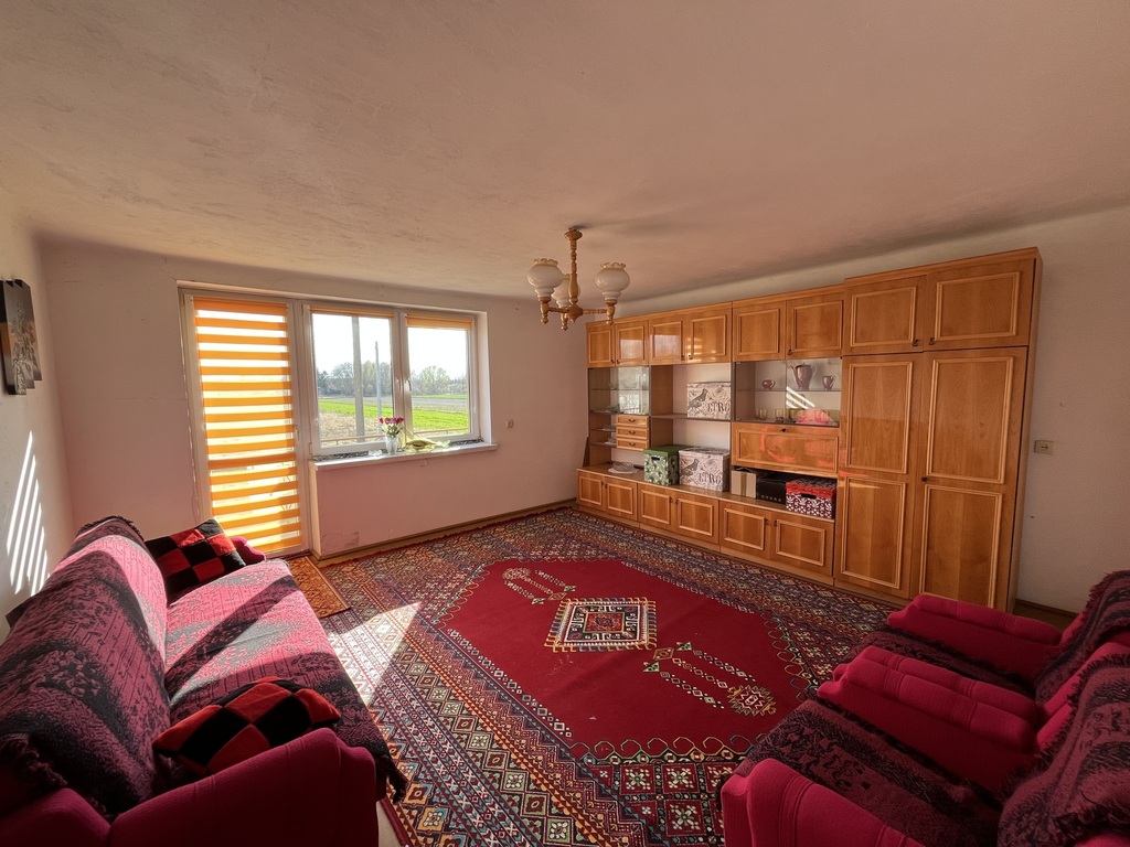 - na piętro prowadzą schody zewnętrzne. Składa się ono z ganka, korytarza, łazienki, kuchni, trzech dużych pokoi. Powierzchnia podobnie 96 m2. Okna plastikowe, podłogi z desek.