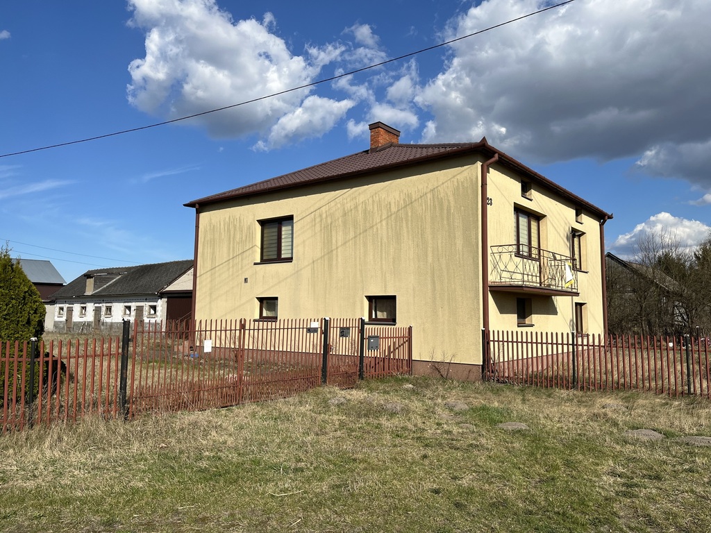 -dom piętrowy z zamieszkałą częścią w suterenie. Suterena i piętro oddzielone z osobnymi wejściami. Na poziomie "0" w suterenach znajdują się pomieszczenia w postaci korytarza, kuchni, dwóch pokoi, spiżarni i kotłowni. Pomieszczenia w sumie o powierzchni 93,5 m2 w pełni przystosowane do zamieszkania.
