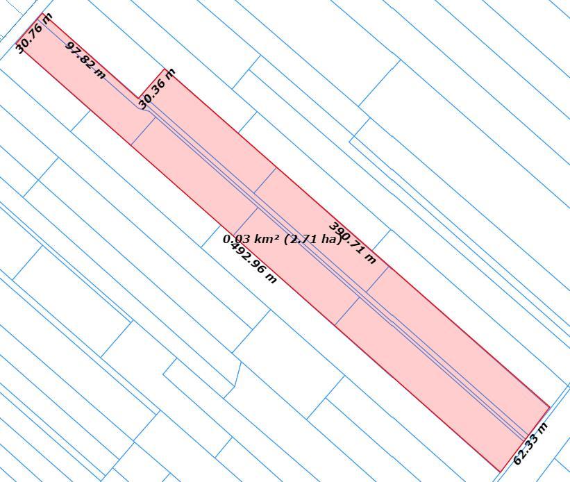 - wym. ok. szer. 32 m x 493m dł.; Następnie działka rozszerza się do wym. ok. szer. 62 m.