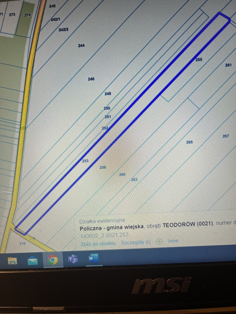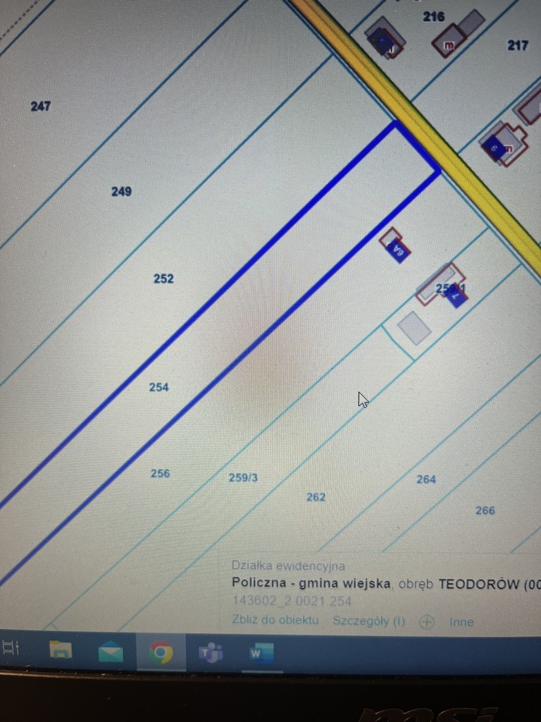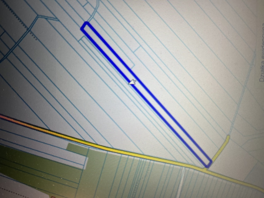 - szerokość działki to 24,5 m i długość ok. 800 m. Działka podzielona administracyjnie na dwie części.