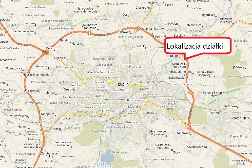Duża działka w miejscowości Długie 1.8 km od granic Lublina przy węźle Lublin-Tatary