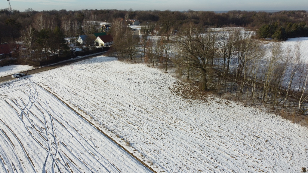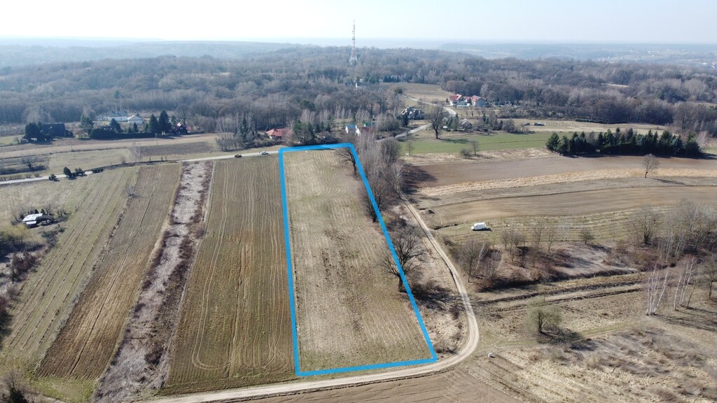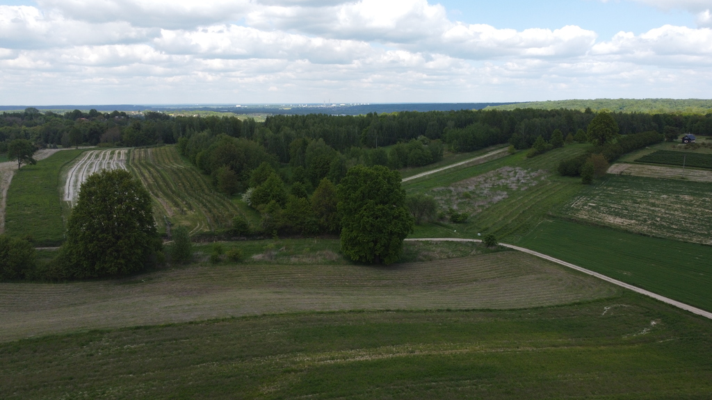 - działka lekko nachylona w dół patrząc od strony drogi z pięknym widokiem na tereny przyległe.