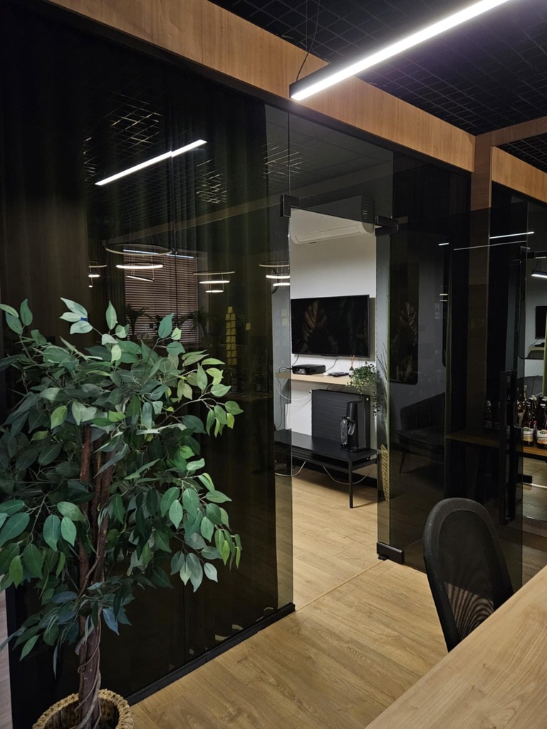 Sufity podwieszane o ażurowym designie oraz nowoczesne oświetlenie tworzą przytulną i funkcjonalną przestrzeń, idealną do prowadzenia różnorodnych działalności.