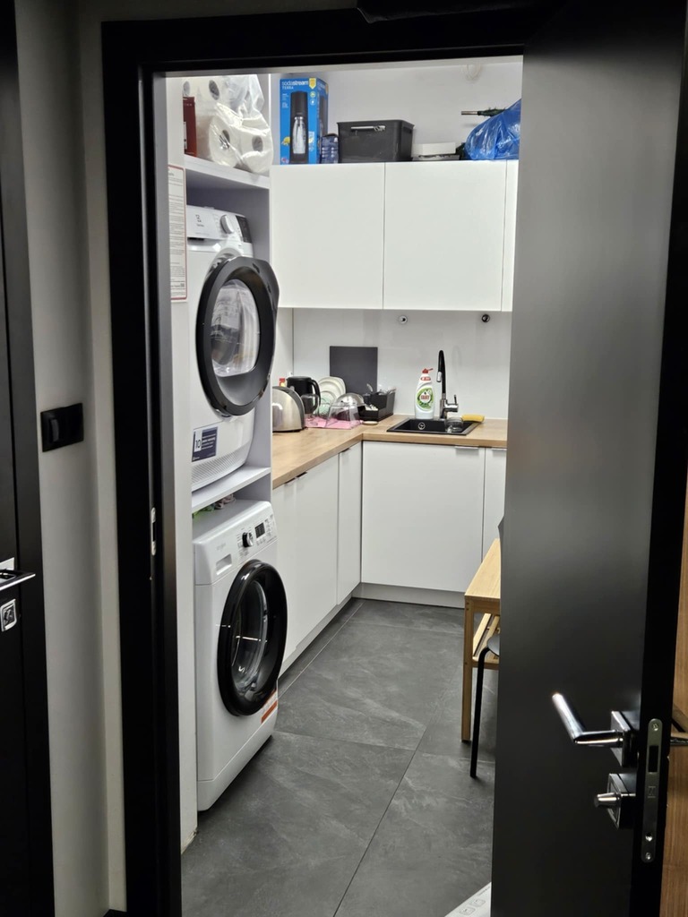 Na podłogach znajdują się eleganckie płytki gresowe oraz panele winylowe, a zabudowy meblowe zostały wykonane na specjalne zamówienie z wysokiej jakości płyty meblowej.