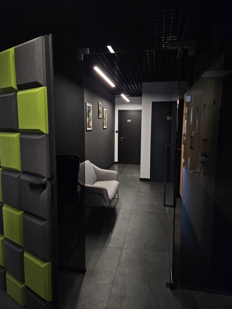 Część biurowa o powierzchni 80 m², wcześniej użytkowana jako studio EMS. Znajduje się tu przestronna część biurowa, dwie łazienki z prysznicami, pokój socjalny, oraz korytarz z dużą szafą. Dodatkowo, wydzielony za szybą pokój idealny do spotkań biznesowych lub wypoczynku.
