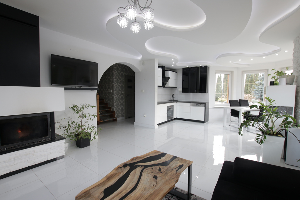 - kominek który nadaje klimatu w zimowe dni ale także dzięki turbinie rozprowadza ciepłe powietrze do każdego pomieszczenia