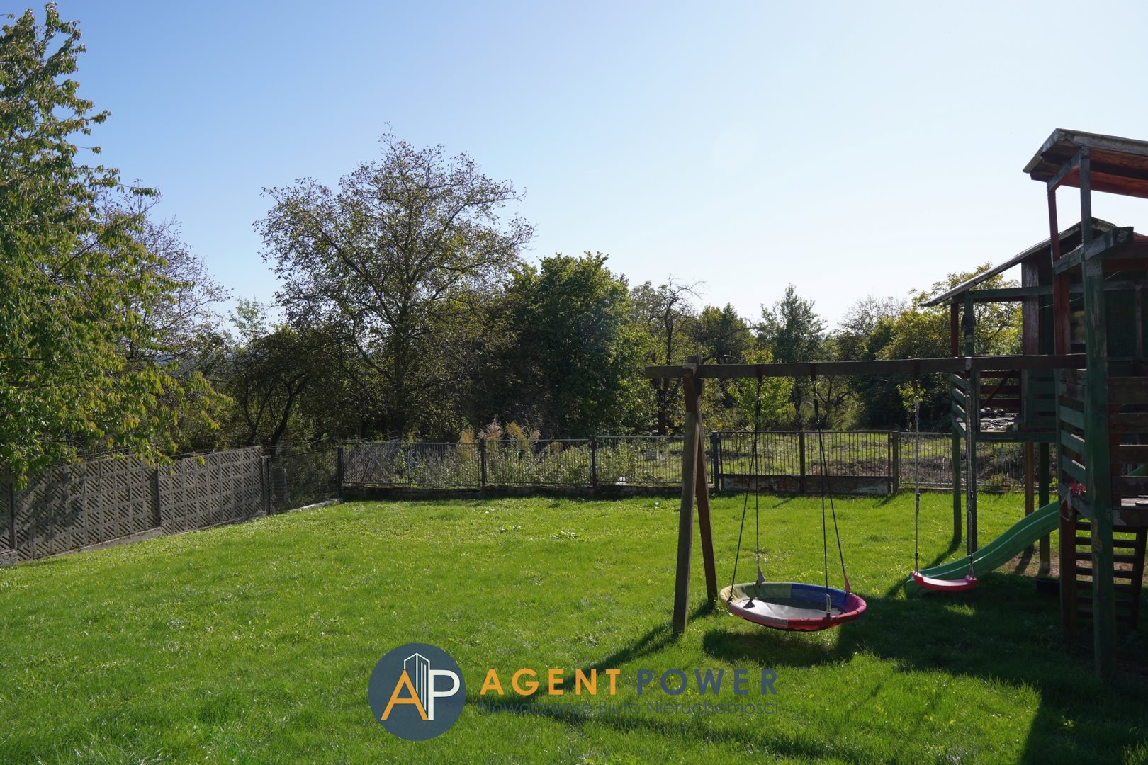 Teren lekko płaski / częściowo zagospodarowany: trawnik, plac zabaw dla dzieci, miejsce na grilla/altanę.