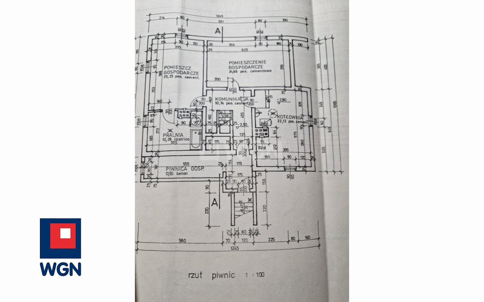 - piwnica: kotłownia, 2 pomieszczenia gospodarcze, pralnia