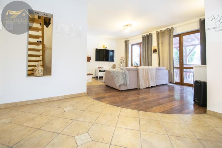 Dom wyposażony jest w pompę ciepła i ogrzewanie podłogowe, co zapewnia komfort i niższe koszty utrzymania.