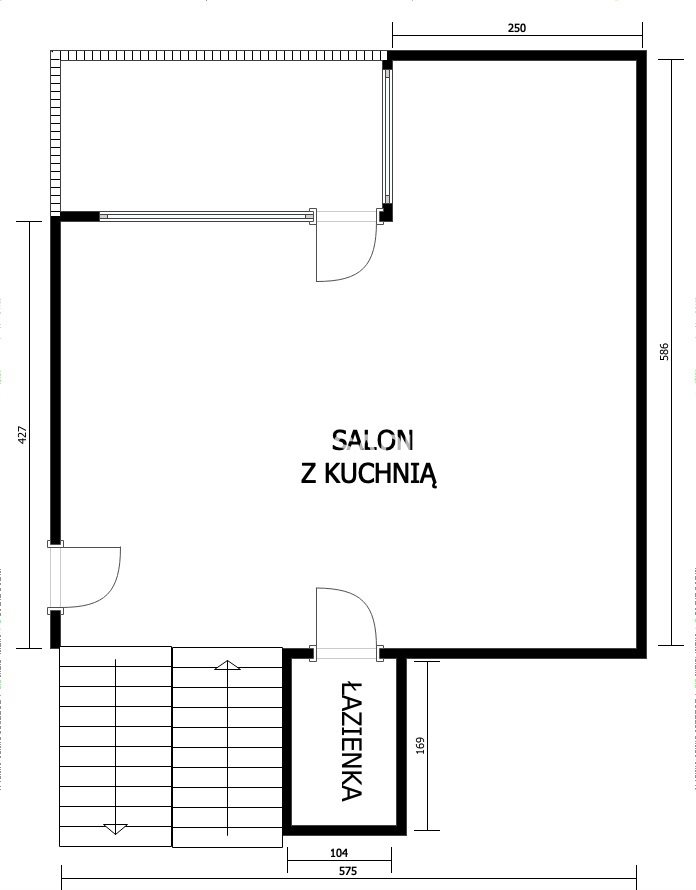 Poziom I: salon z aneksem kuchennym i wyjściem na taras, łazienka