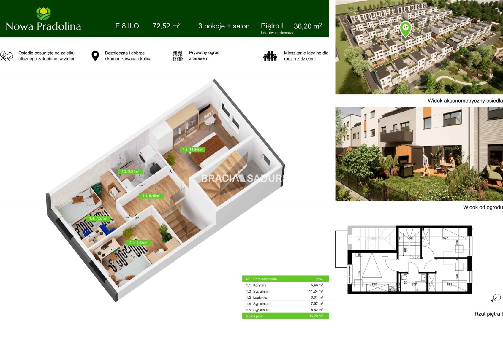 Prezentowane mieszkanie to przestronne, 2 poziomowe, 4 pokojowe mieszkanie na parterze i 1 piętrze o pow. 72,52 m 2 z ogródkiem o pow. 35,90 m 2 . Na poziomie parteru znajduje się salon z aneksem kuchennym o pow. 25,62 m 2 , łazienka (4,05 m 2 ) oraz wiatrołap i przedpokój. W ogródku komórka narzędziowa. Na 1 piętrze znajdują się 3 pokoje (11,24 m 2 ; 8,62 m 2 i 7,57 m 2 ), łazienka (3,31 m 2) oraz przedpokój.