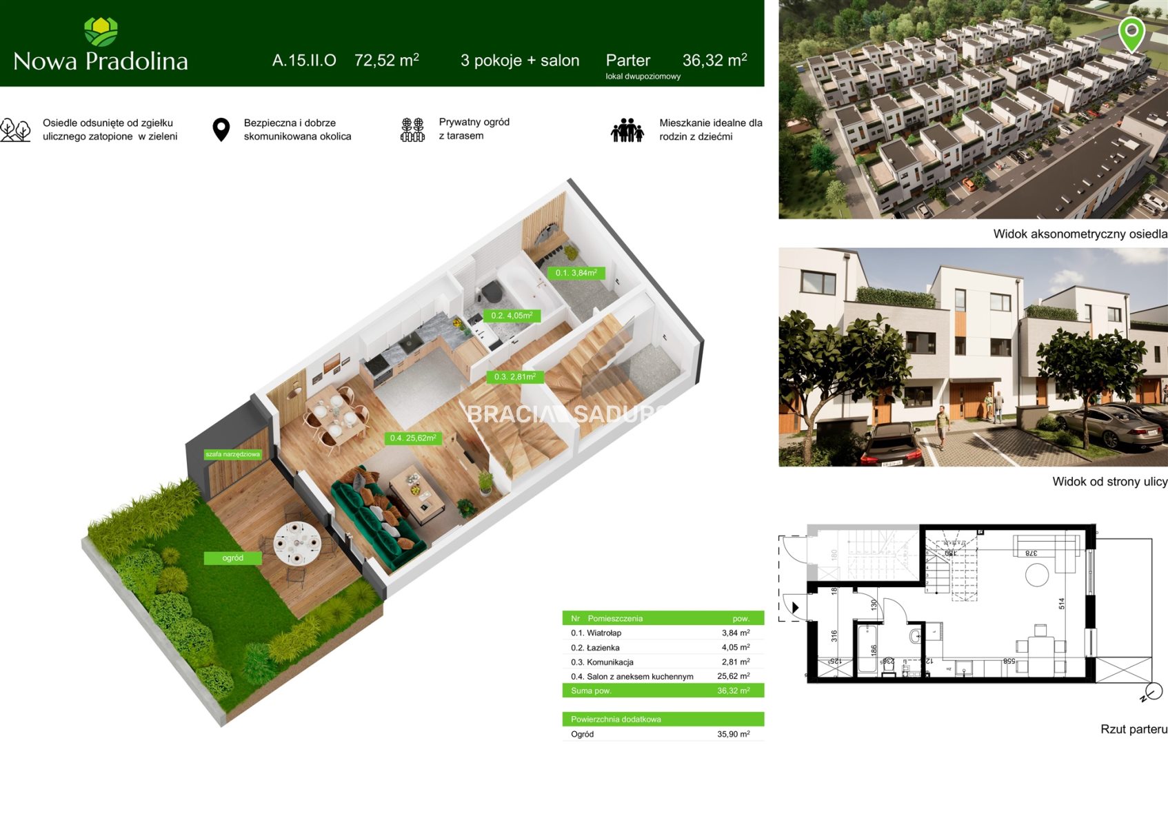 Prezentowane mieszkanie to przestronne, 2 poziomowe, 4 pokojowe mieszkanie na parterze i 1 piętrze o pow. 72,52 m 2 z ogródkiem o pow. 35,90 m 2 .