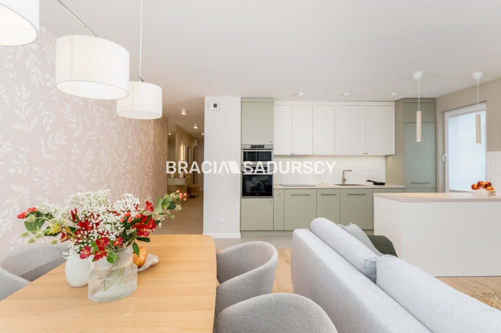 W salonie jest wygodna kanapa, szafka telewizyjna, witryna na porcelanę, stół oraz krzesła. Przestronna kuchnia z dodatkową wyspą zapewnia komfortową przestrzeń do gotowania i magazynowania. Jest wyposażona w cały niezbędny sprzęt AGD tj. płyta indukcyjna, piekarnik, zmywarka, lodówka oraz okap. Mieszkanie z klimatyzacją.