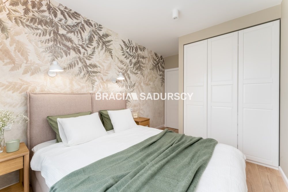 W sypialni jest wygodne i szerokie łóżko wraz z szafkami nocnymi oraz szafa w zabudowie o szerokości 160 cm.