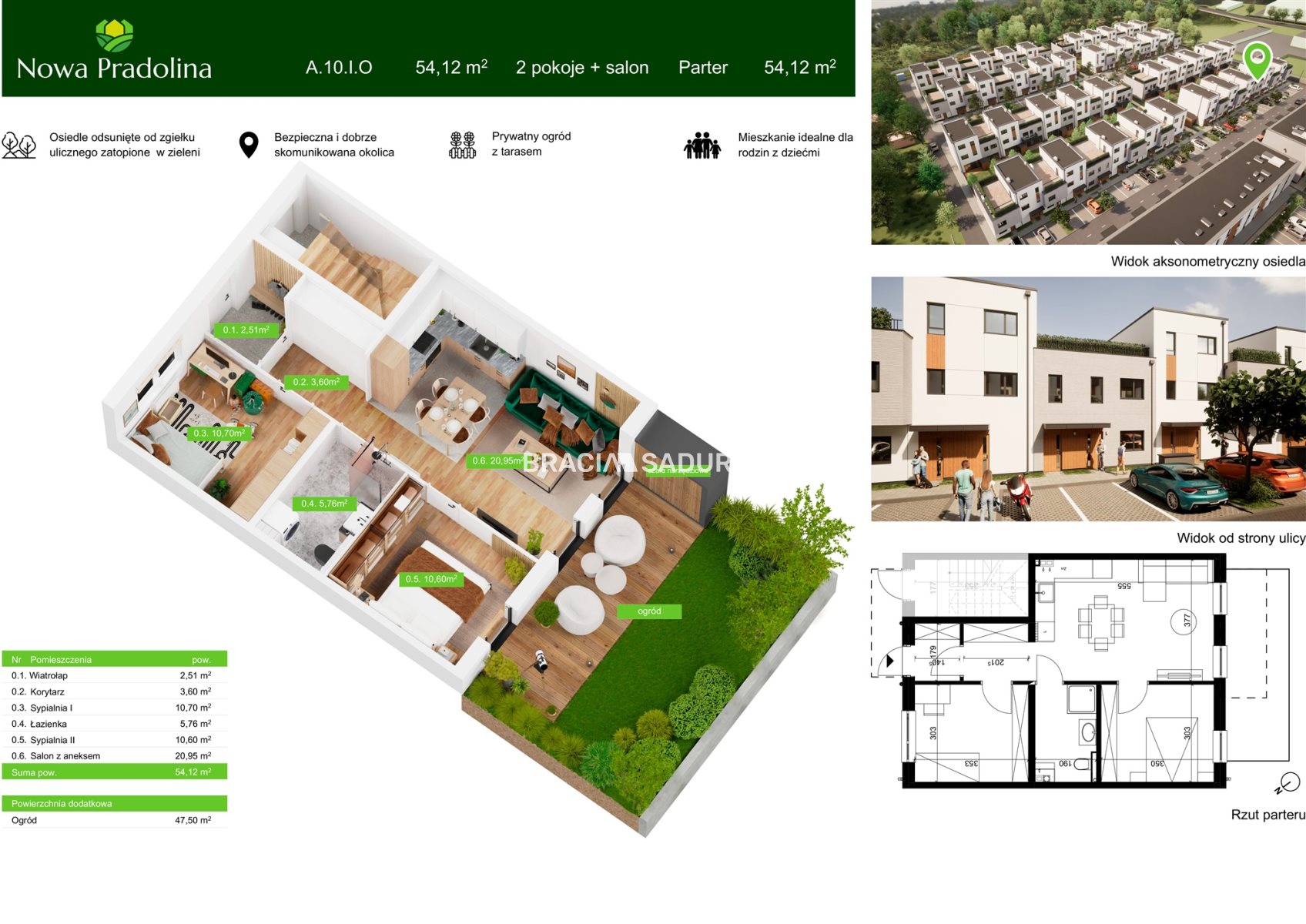 Prezentowane mieszkanie o pow. 54,12 m 2 , znajduje się na parterze. Mieszkanie posiada ogródek o pow. 47,5 m 2 . Składa się z salonu z aneksem kuchennym pow. 20,95 m 2 , 2 sypialni o pow. 10,60 m 2 i 10,70 m 2 , łazienki ( 5,76 m 2 ) oraz wiatrołapu i przedpokoju. W ogródku dodatkowo komórka narzędziowa.