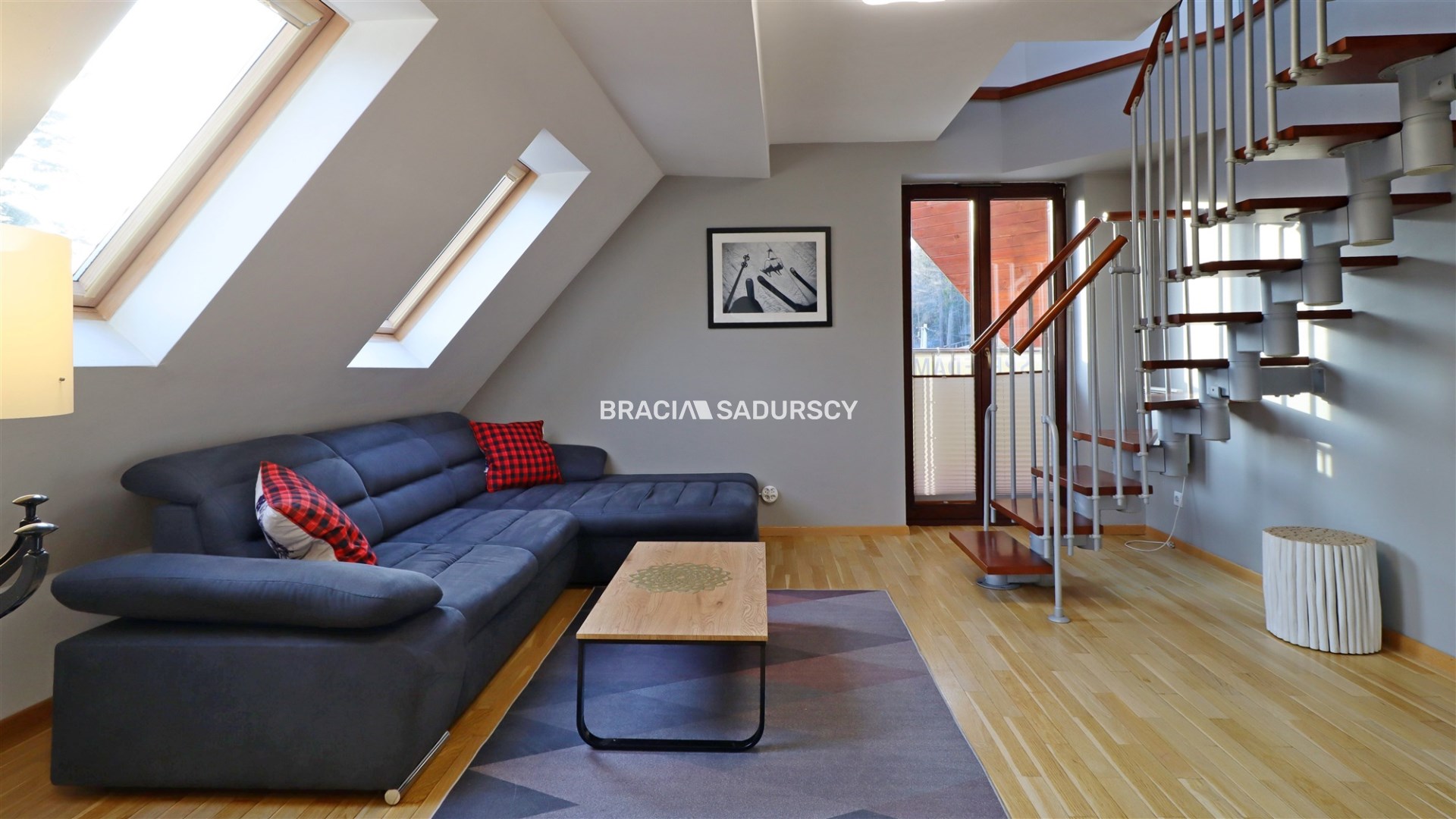 Oferujemy na sprzedaż lub na wynajem długoterminowy przestronny, dwupoziomowy apartament z widokiem na Giewont, usytuowany na 3. piętrze apartamentowca Butorowy Residence w Kościelisku.