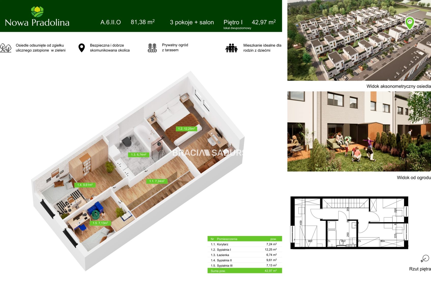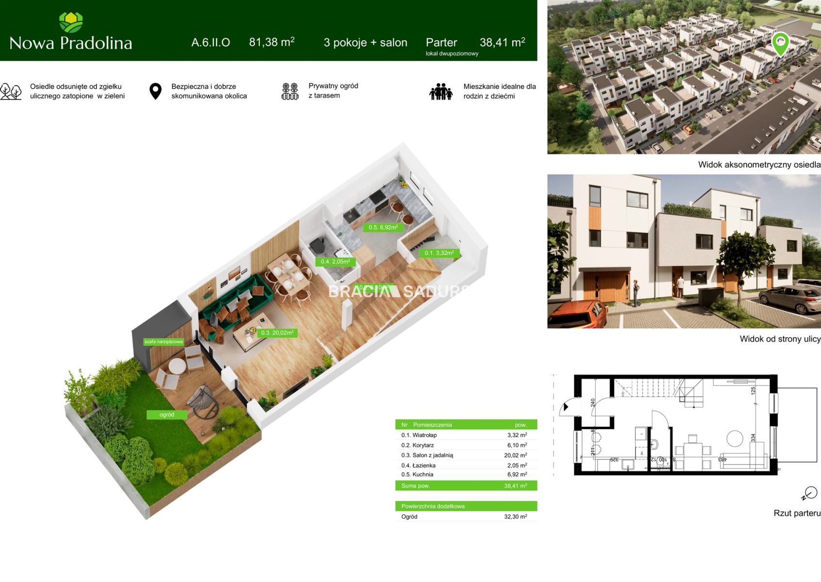 Prezentowane mieszkanie to przestronne, 2 poziomowe, 4 pokojowe mieszkanie na parterze i 1 piętrze o pow. 81,38 m 2 z ogródkiem o pow. 32,30 m 2 .