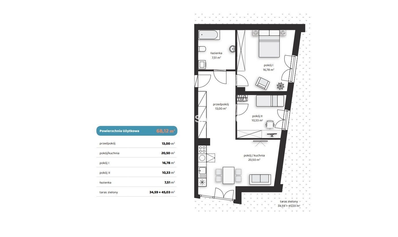 Każdy lokal posiada balkon, taras lub ogródek , stanowiący doskonałą przestrzeń do wypoczynku w otoczeniu zieleni.