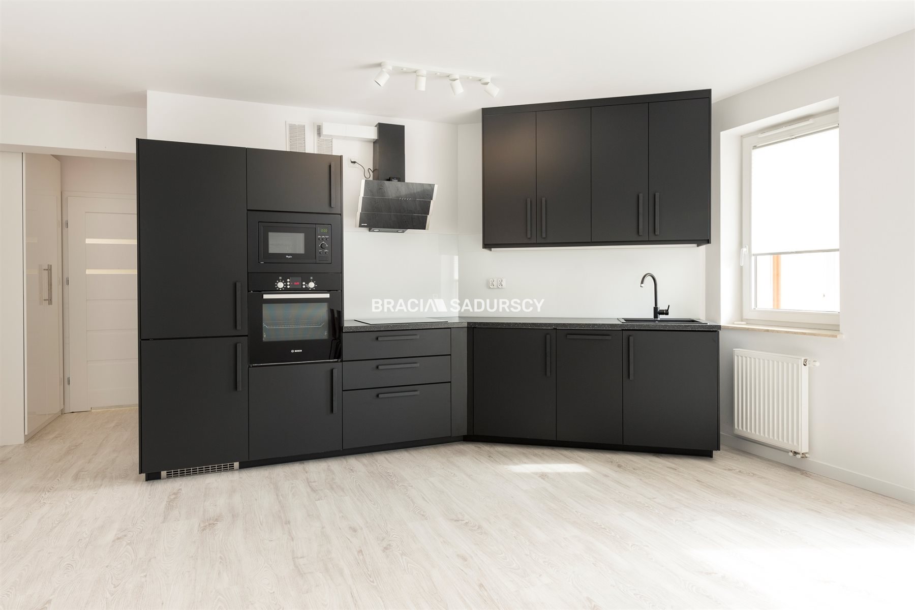 Kuchnia umeblowana i wyposażona w sprzęt AGD ( płyta , lodówka, piekarnik, okap, mikrofala ).