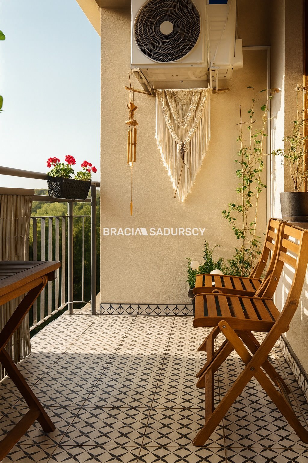 W salonie zamontowano jednostkę klimatyzacji, która rozprowadza chłodne powietrze na całe mieszkanie łącznie z sypialnią.