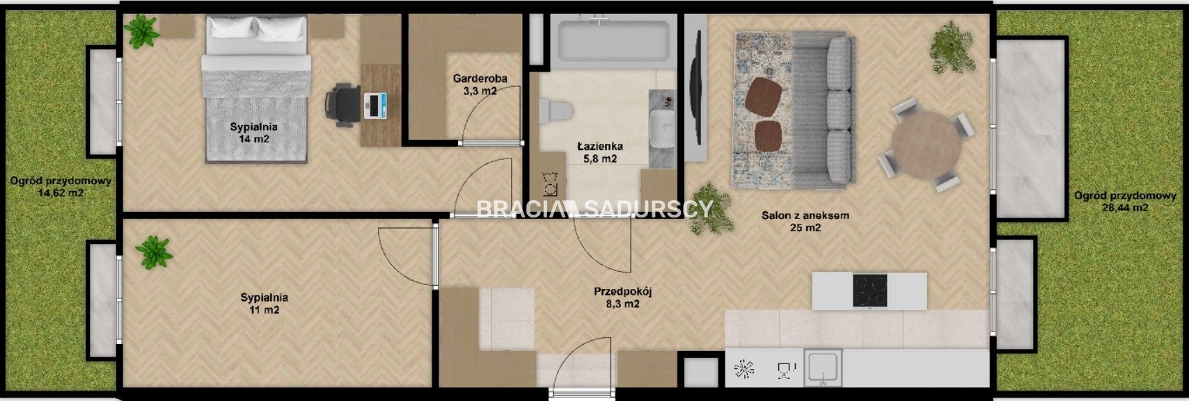 W cenie mieszkania dwa prywatne ogródki - około 155m2.