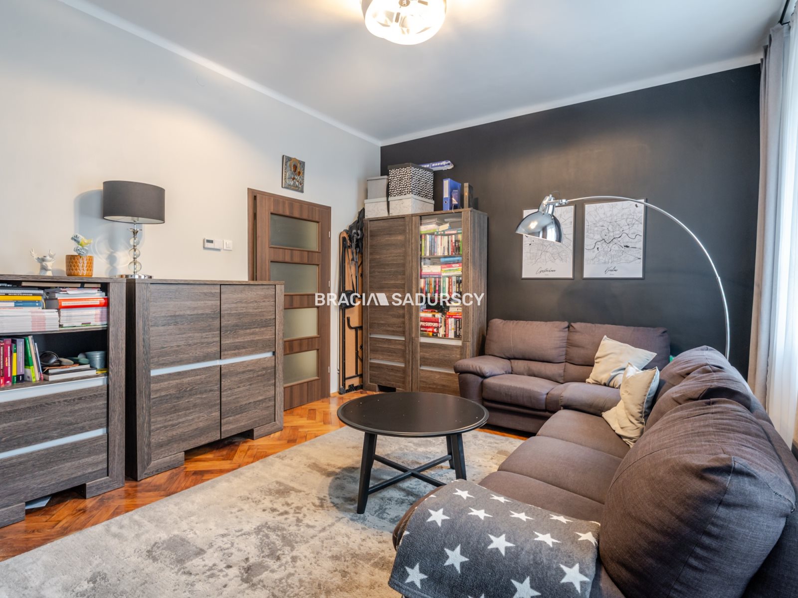 W pokojach klasyczny, dębowy parkiet w klimacie krakowskich kamienic.
