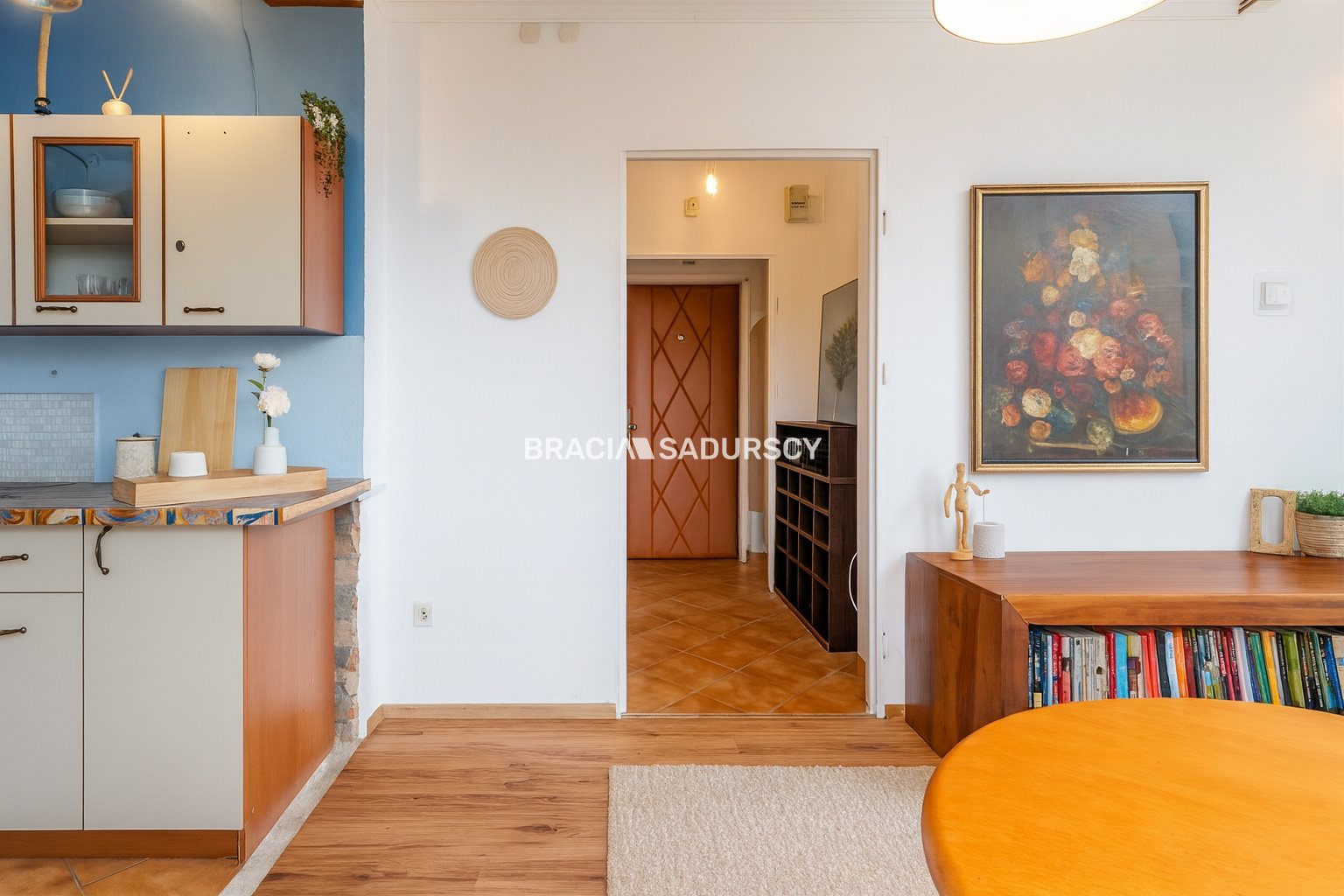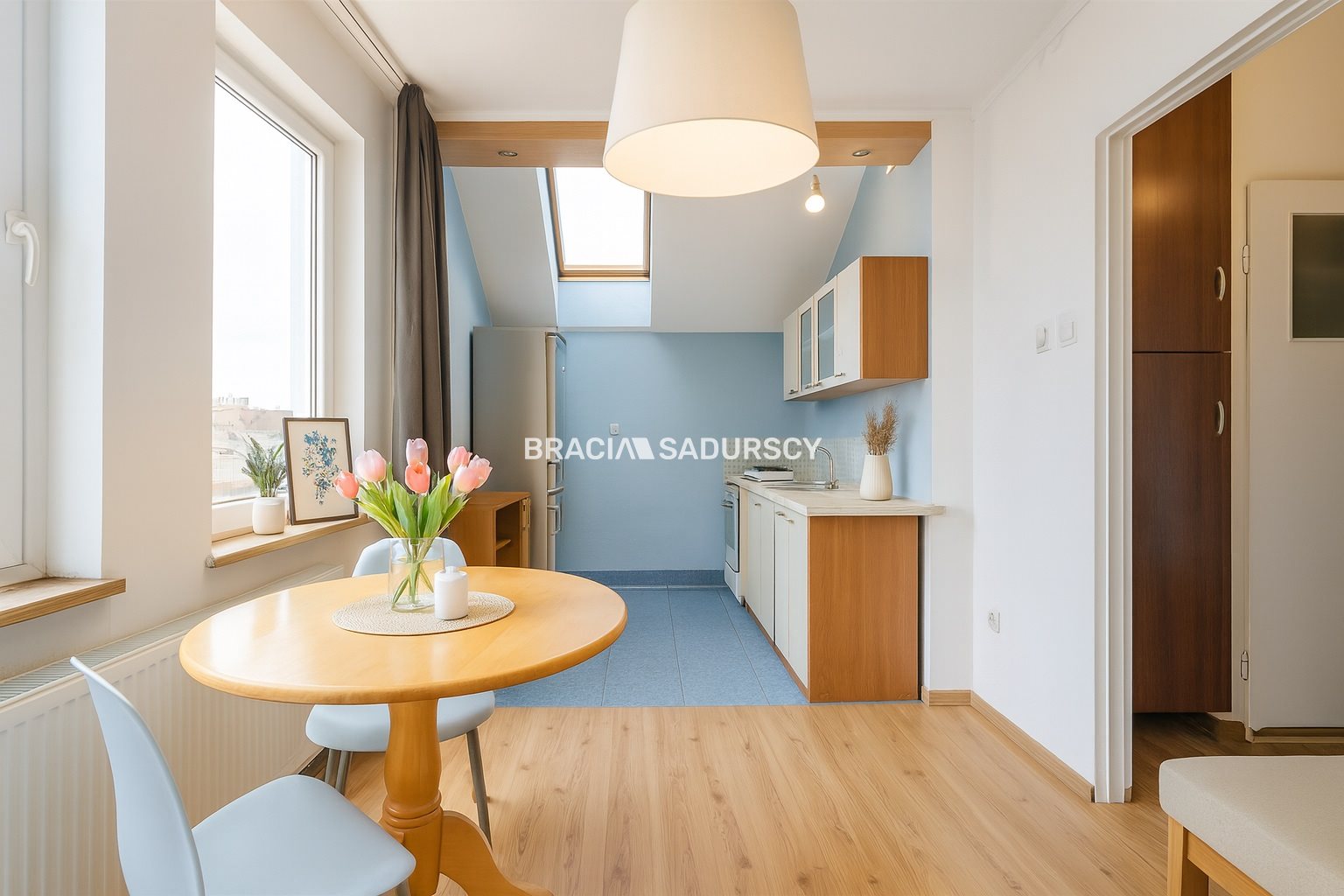 Z okien salonu rozpościera się piękny widok na dachy pobliskich budynków i drzewa, a wnikliwe oko przy dobrej pogodzie dostrzeże nawet Kopiec Kościuszki. Ustawny salon połączony z jadalnią i kuchnią stanie się sercem domu, w którym chętnie odpoczniemy w gronie rodziny czy przyjaciół.