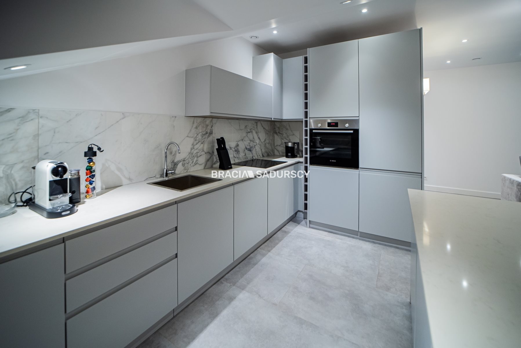 bieli. Zabudowa zawiera sprzęty renomowanych marek: piekarnik, płyta indukcyjna i zmywarka Bosch, lodówka