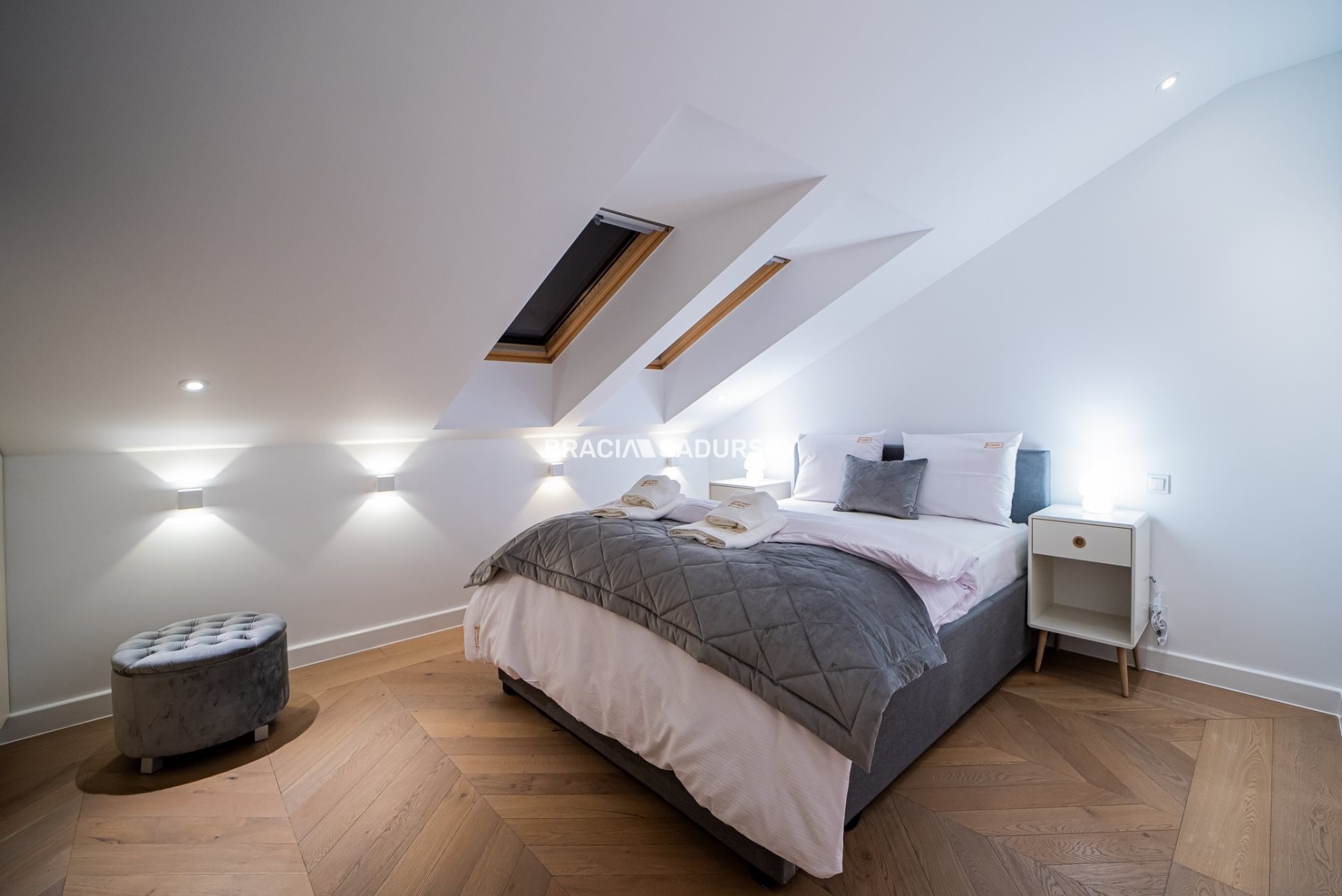 Sypialnie posiadają dedykowaną zabudowę meblową, w tym szafy na wymiar dostosowane do układu ścian oraz