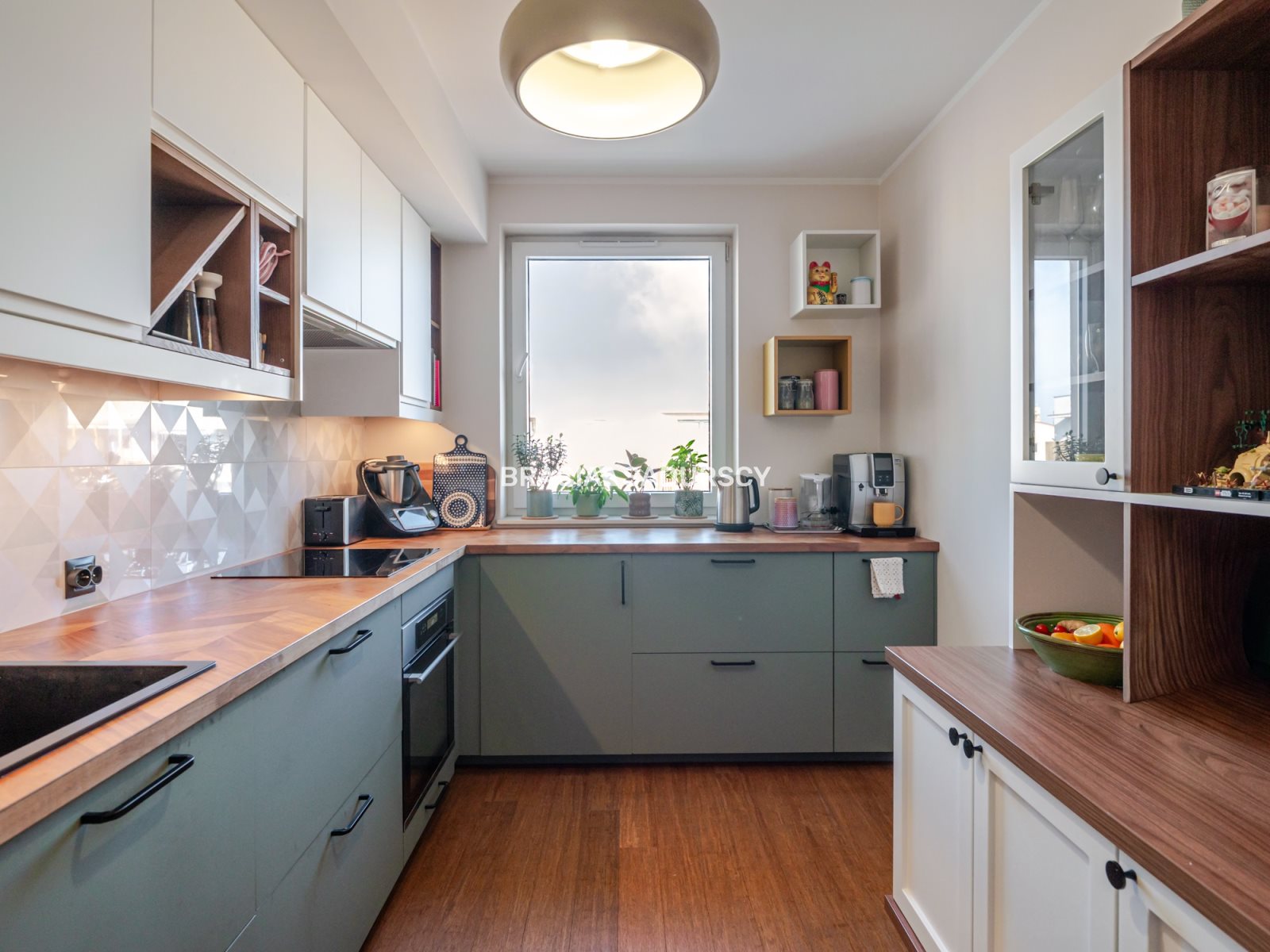 - w kuchni blat fornirowany oraz meble na wymiar wyposażone w sprzęt agd: płyta indukcyjna, piekarnik, zmywarka, lodówko-zamrażarka
