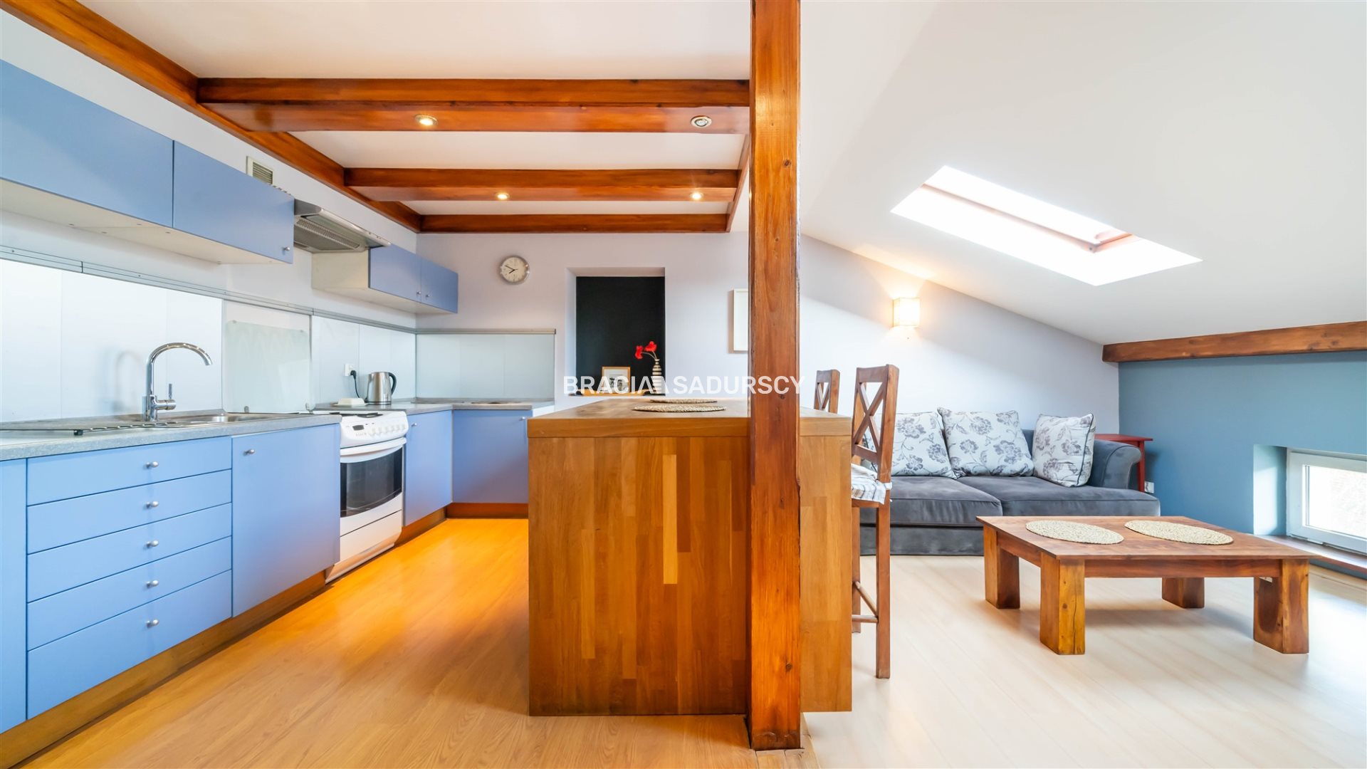 przestronny salon z aneksem kuchennym ,