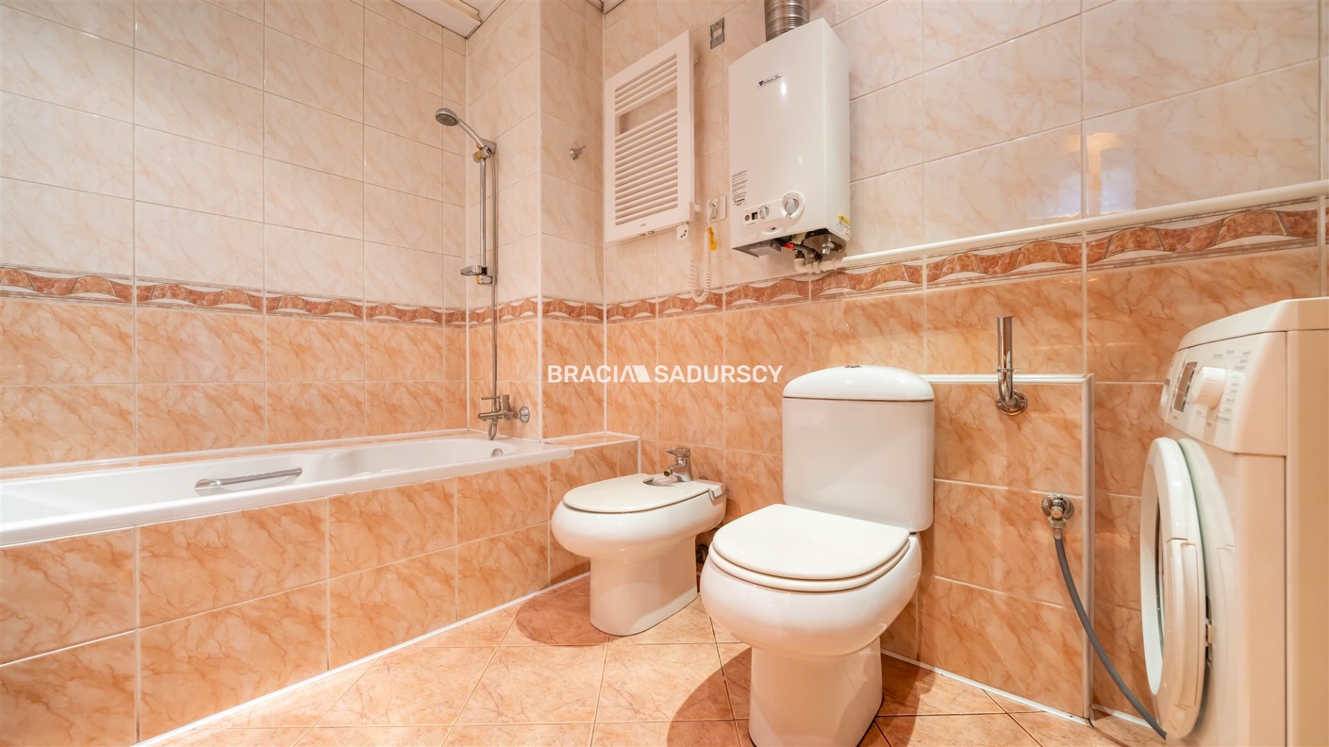 łazienkę z wanną, WC oraz pralką .