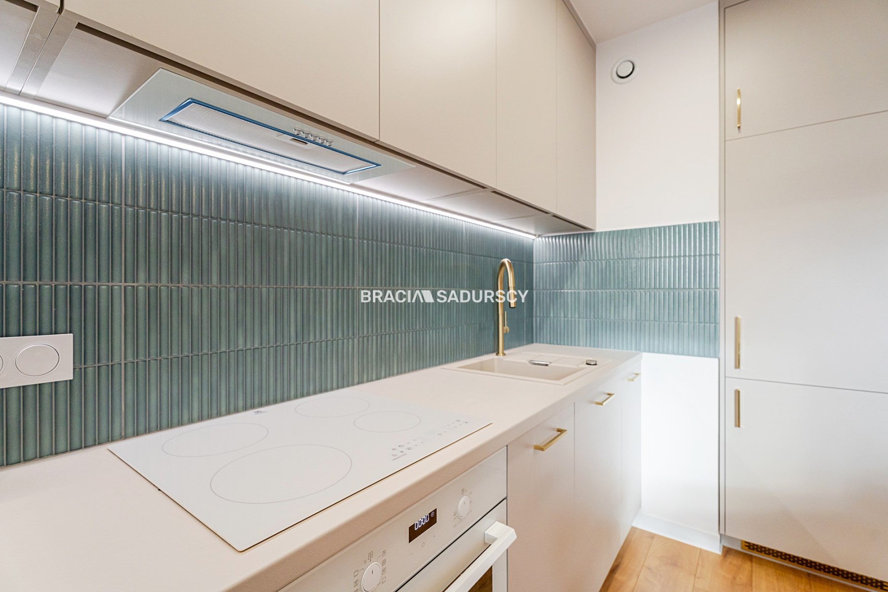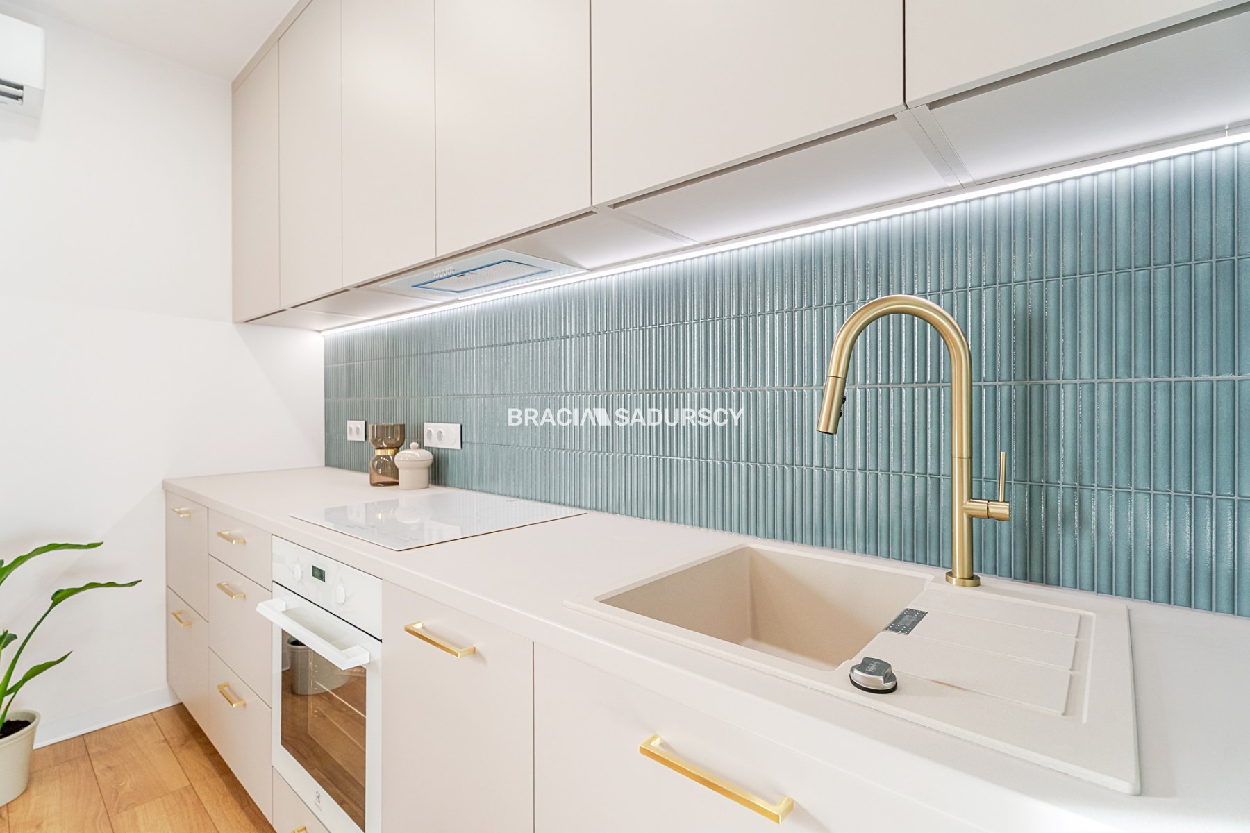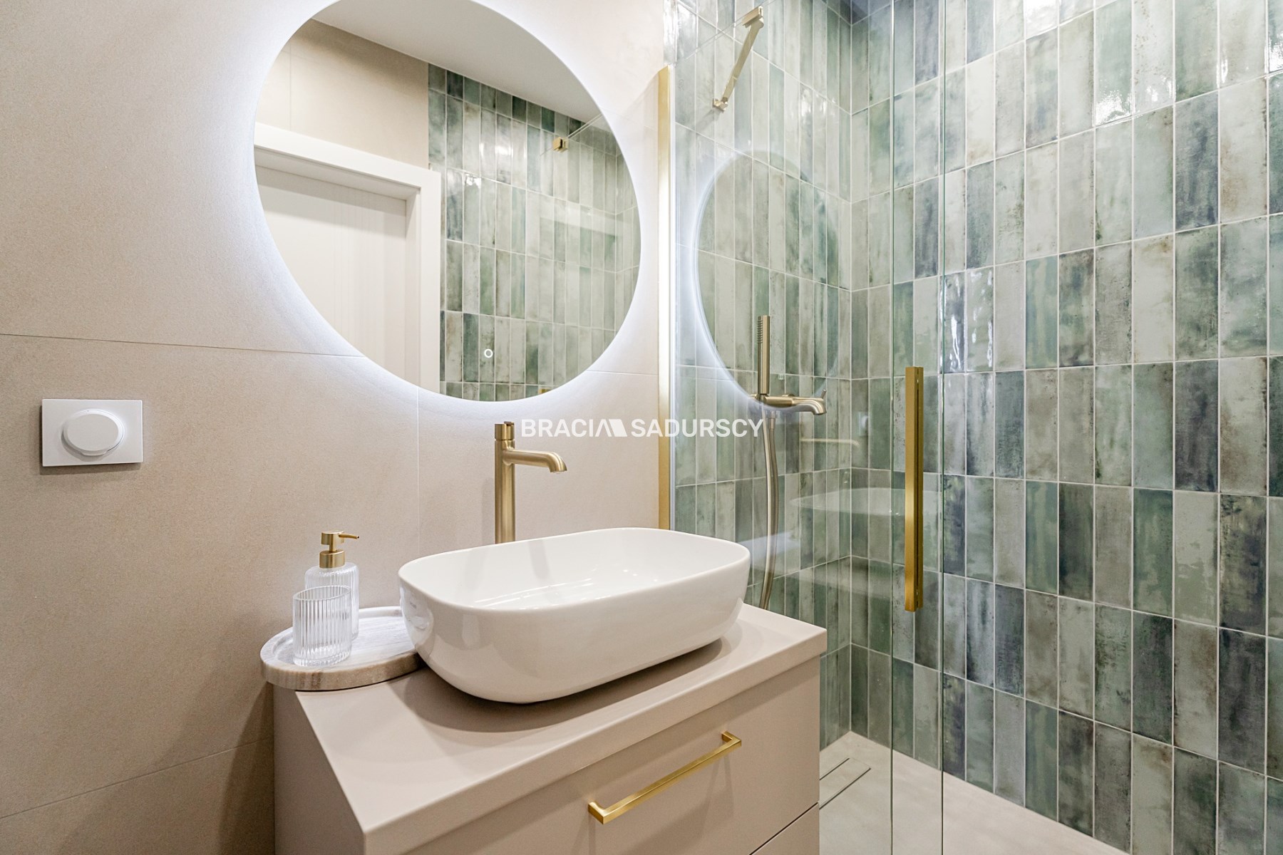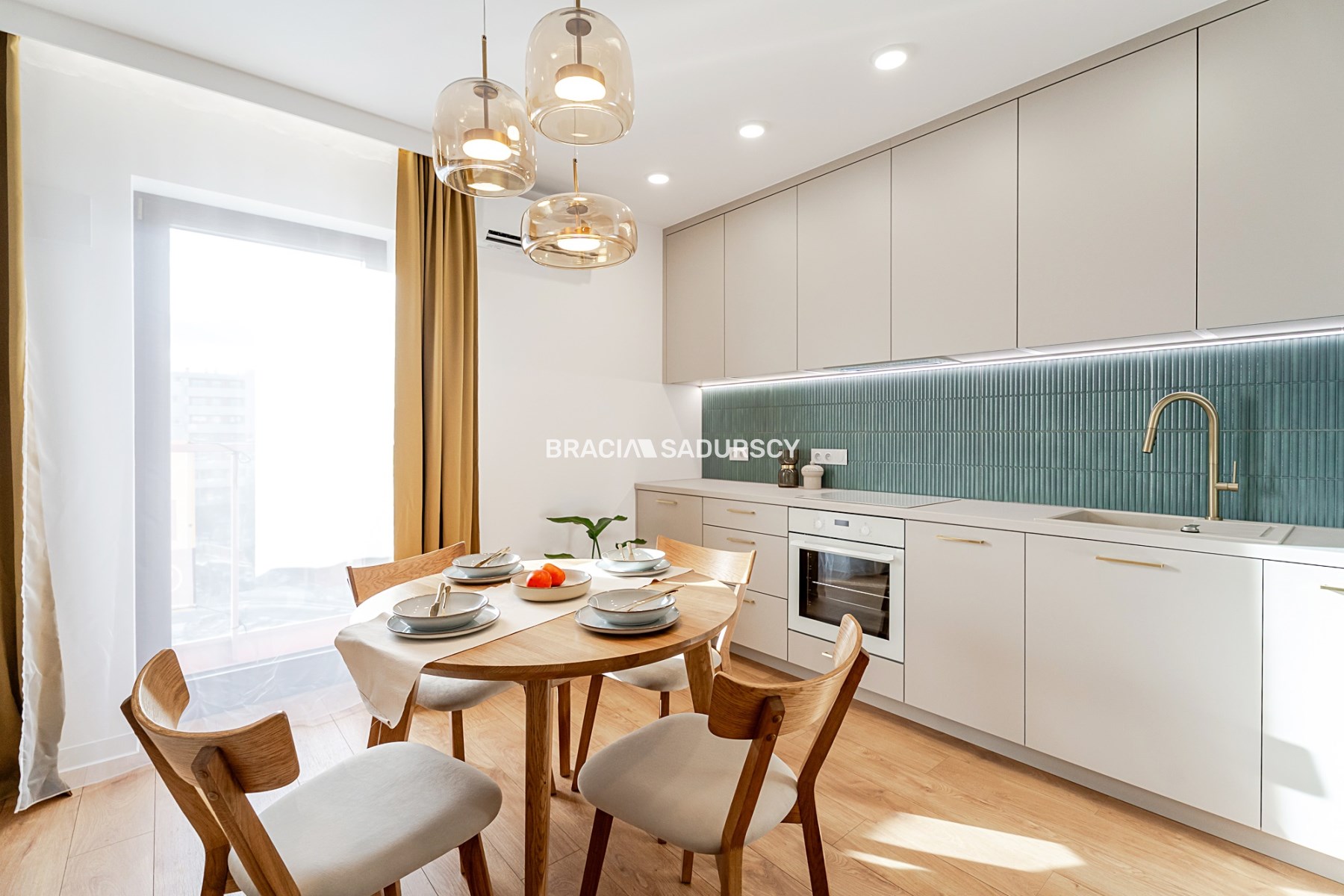 Nowoczesne mieszkanie w nowym budownictwie z 2024 r. (osiedle Górka Narodowa). Składa się z salonu z aneksem kuchennym (panele na podłodze, zabudowa kuchenna), osobnej sypialni z wyjściem na balkon, łazienki z prysznicem walk‑in i podwieszaną toaletą (gres, pralko‑suszarka w zabudowie), oraz holu z zabudową.