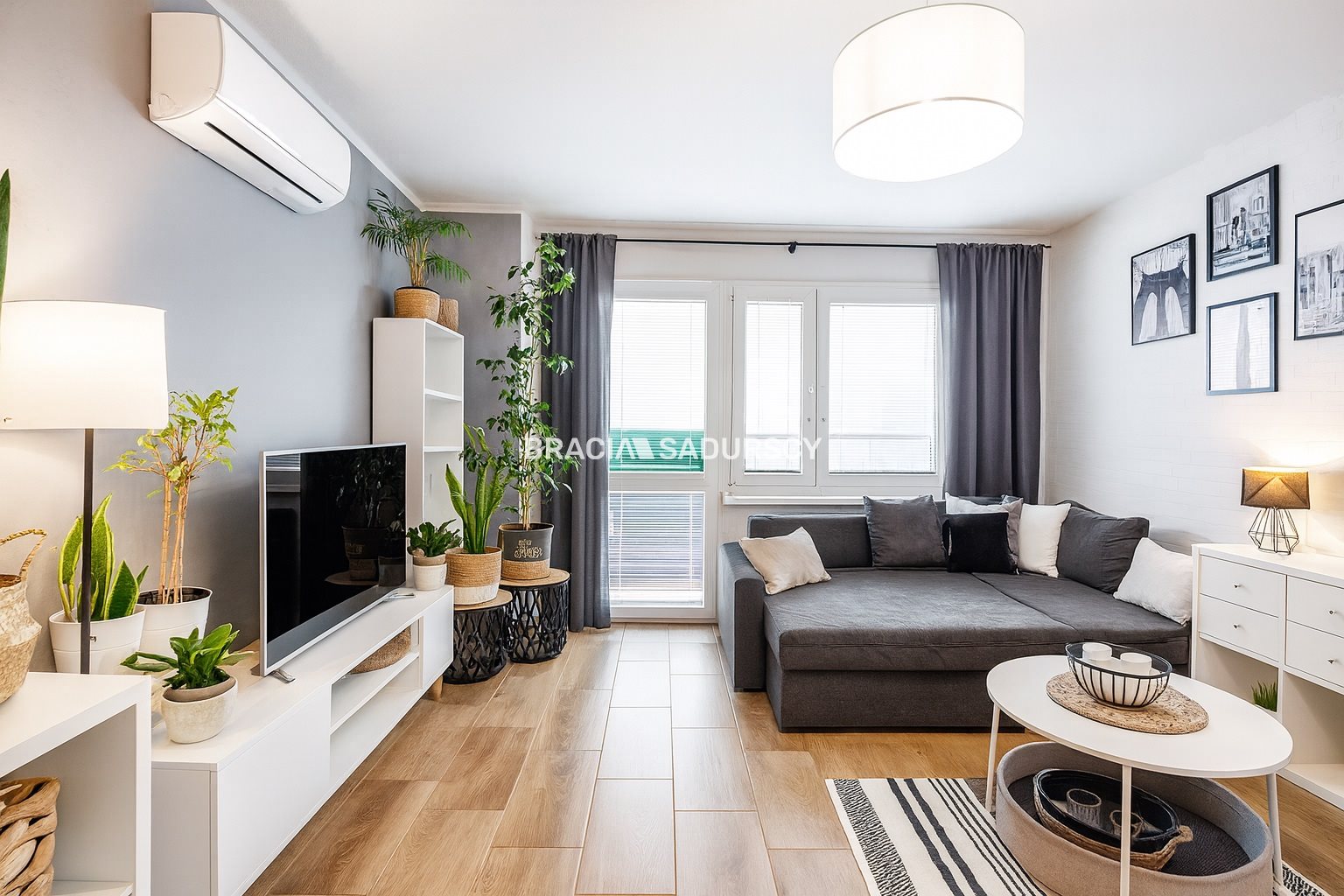 W dużym pokoju zamontowana klimatyzacja (z funkcją grzania i chłodzenia).