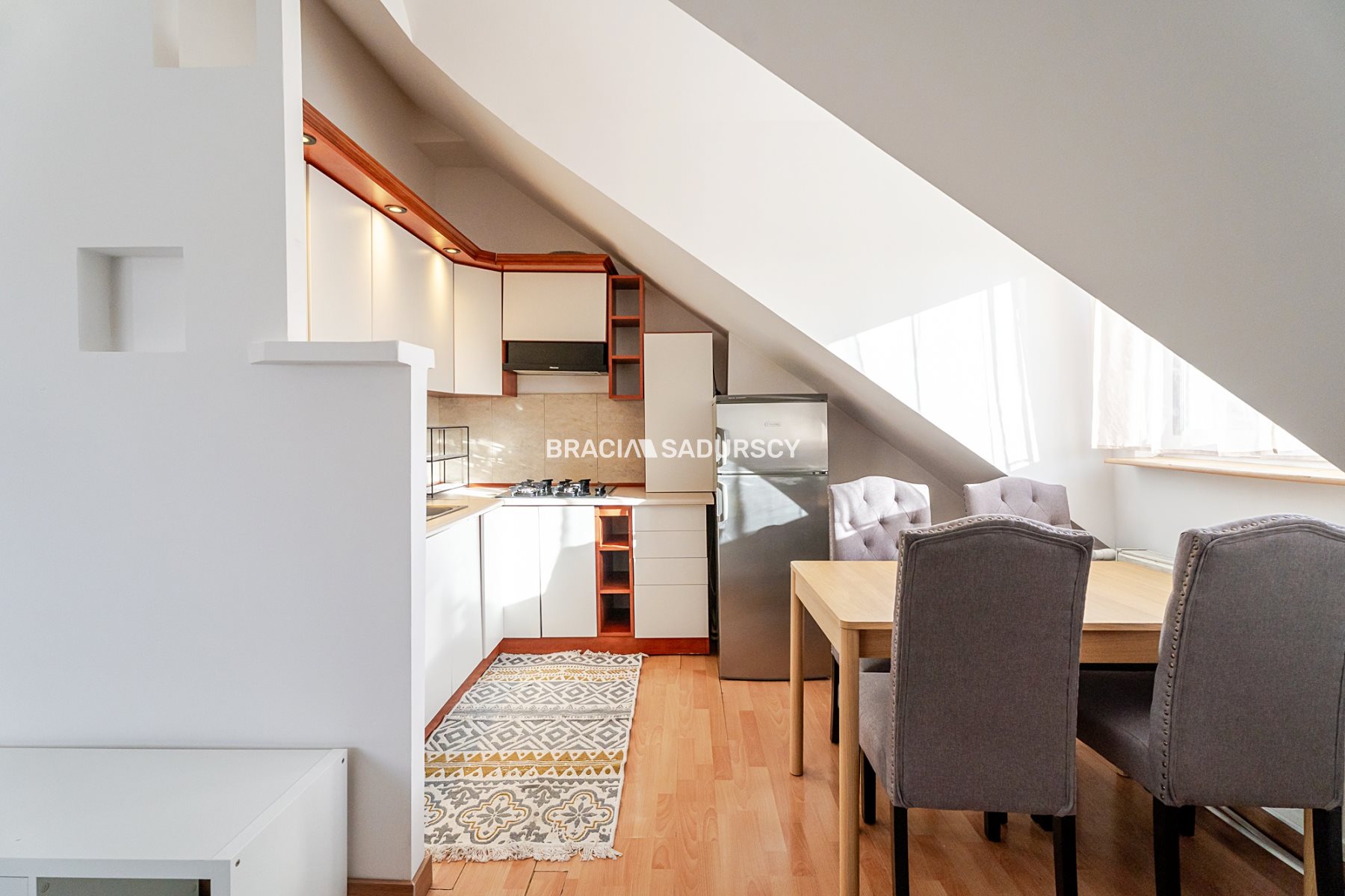 - przestronnego salonu z aneksem kuchennym (24,2 m²) - kuchnia wyposażona w meble wykonane na wymiar oraz sprzęt AGD (lodówka, płyta gazowa, zmywarka).