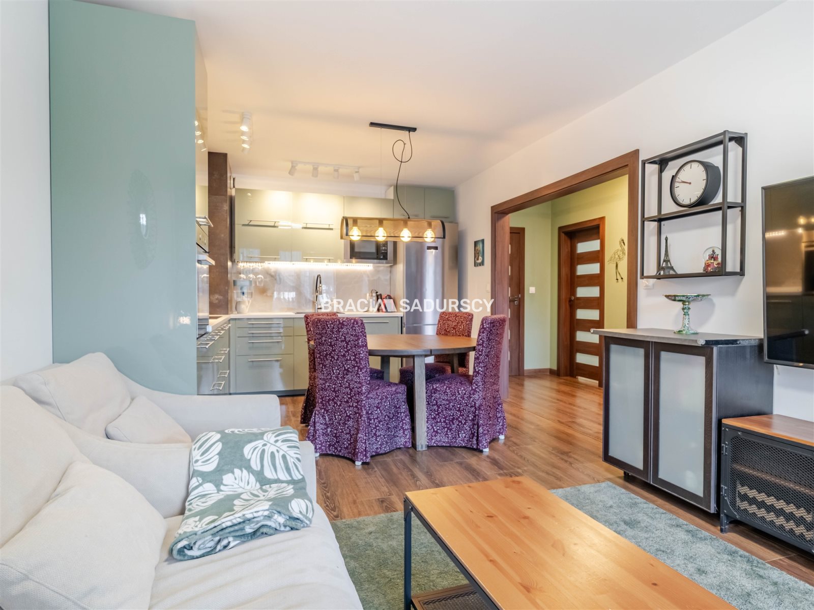 Salon z w pełni wyposażonym aneksem kuchennym w zabudowie o pow. ~23,4 m2.