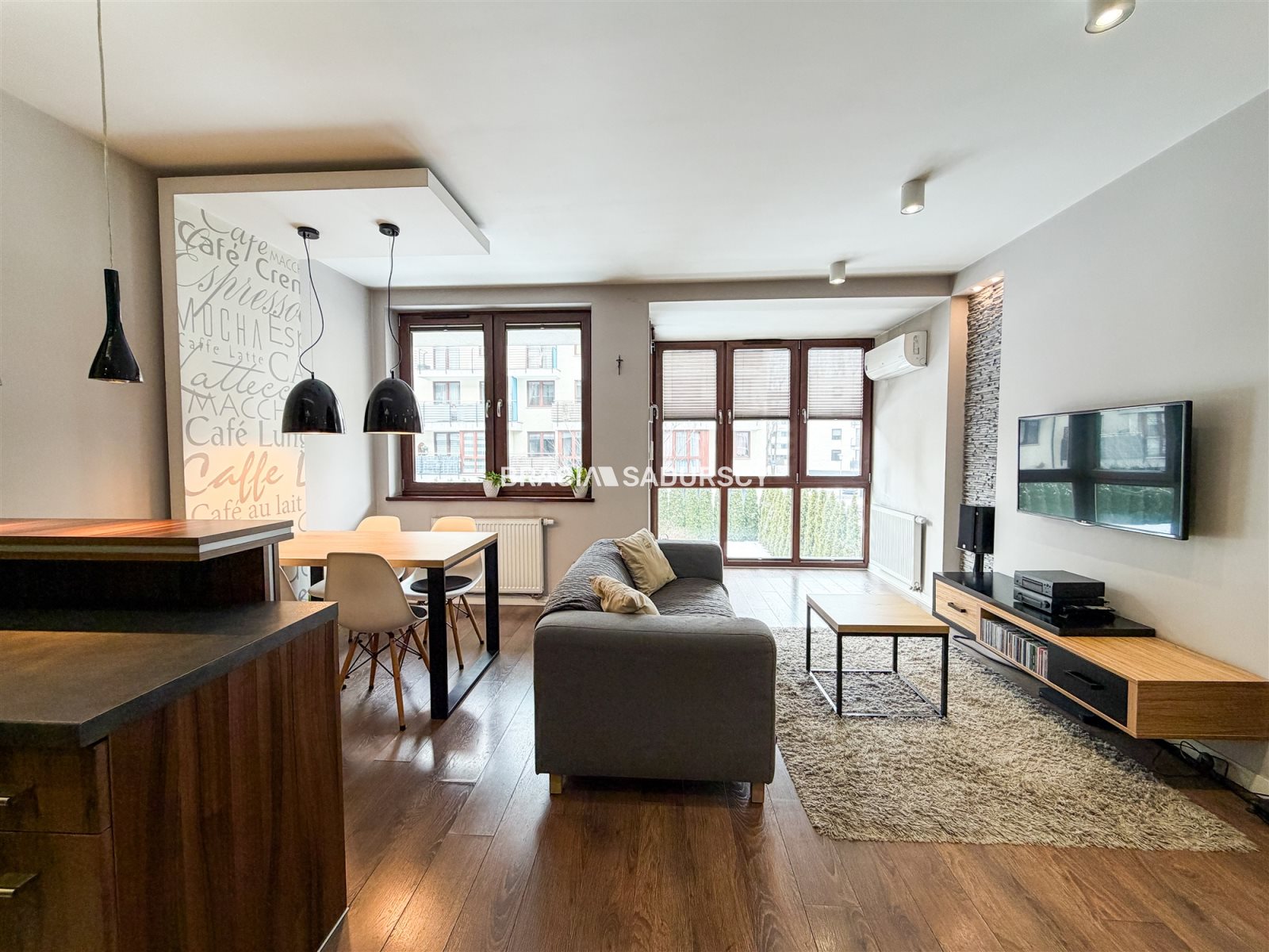 - Kuchnia: lodówka w zabudowie, piekarnik, płyta indukcyjna, zmywarka, pralka.