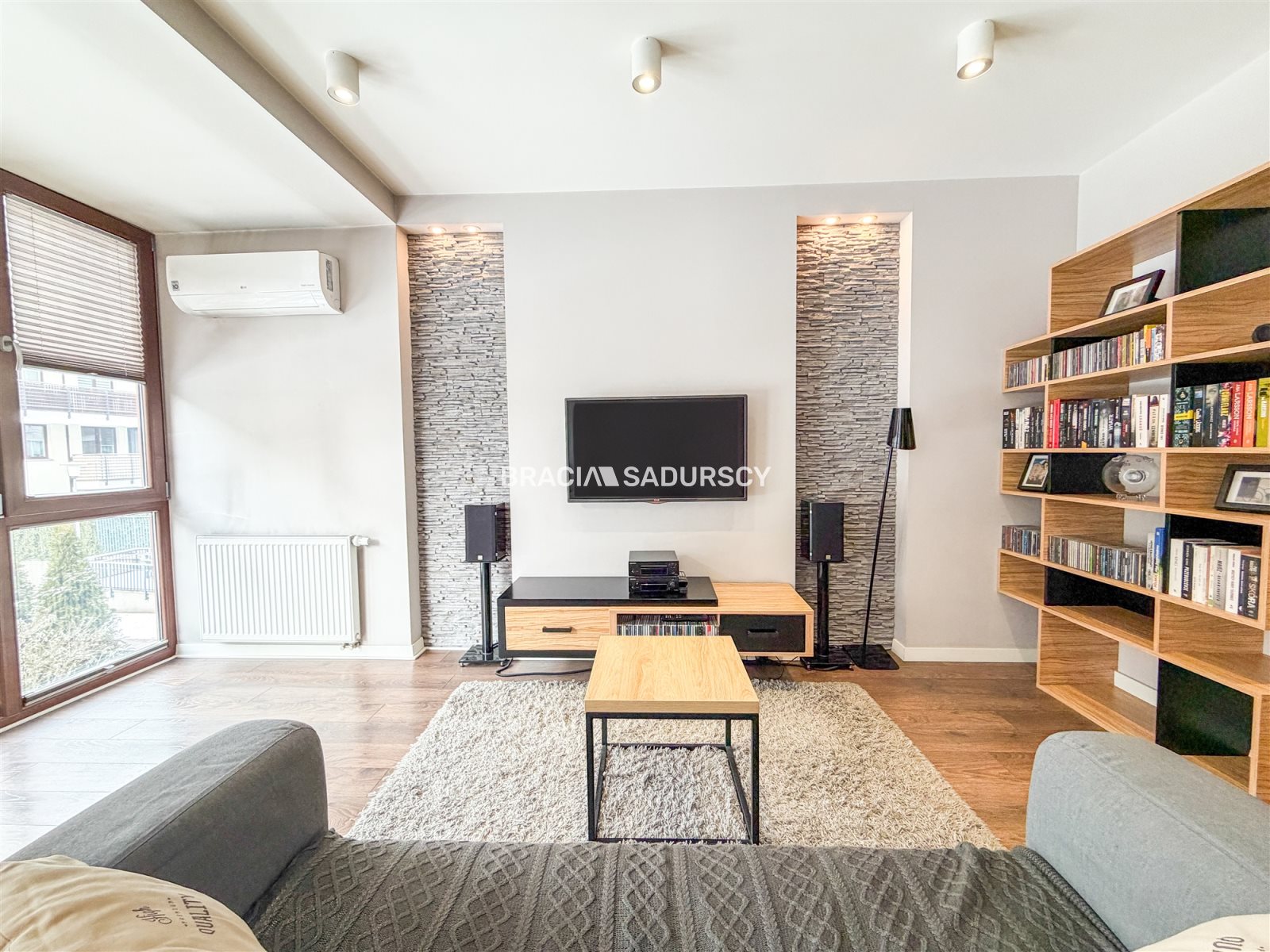 - Salon: kanapa, stolik kawowy, stół i cztery krzesła, telewizor z podstawowym pakietem tv, regał na książki, klimatyzacja .